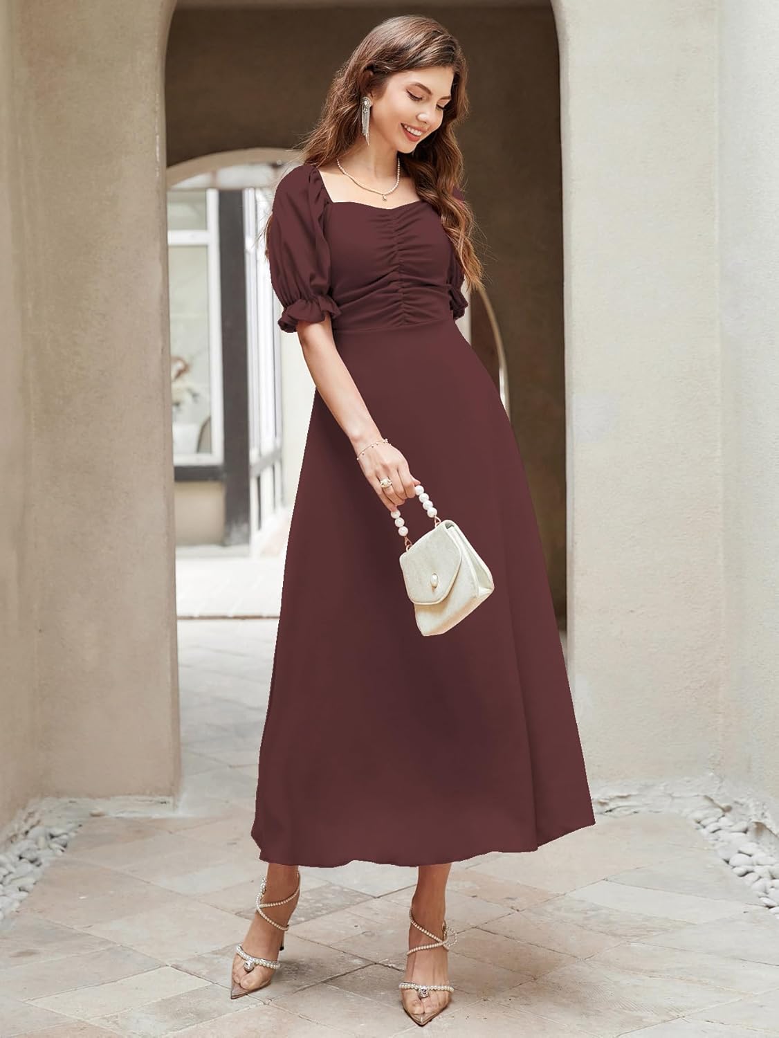 Shasmi Girl’s & Women’s Solid A-Line Ruched Puff Sleeve Maxi Long Evening One Piece Long Dress for Women Stylish (Dress 131)