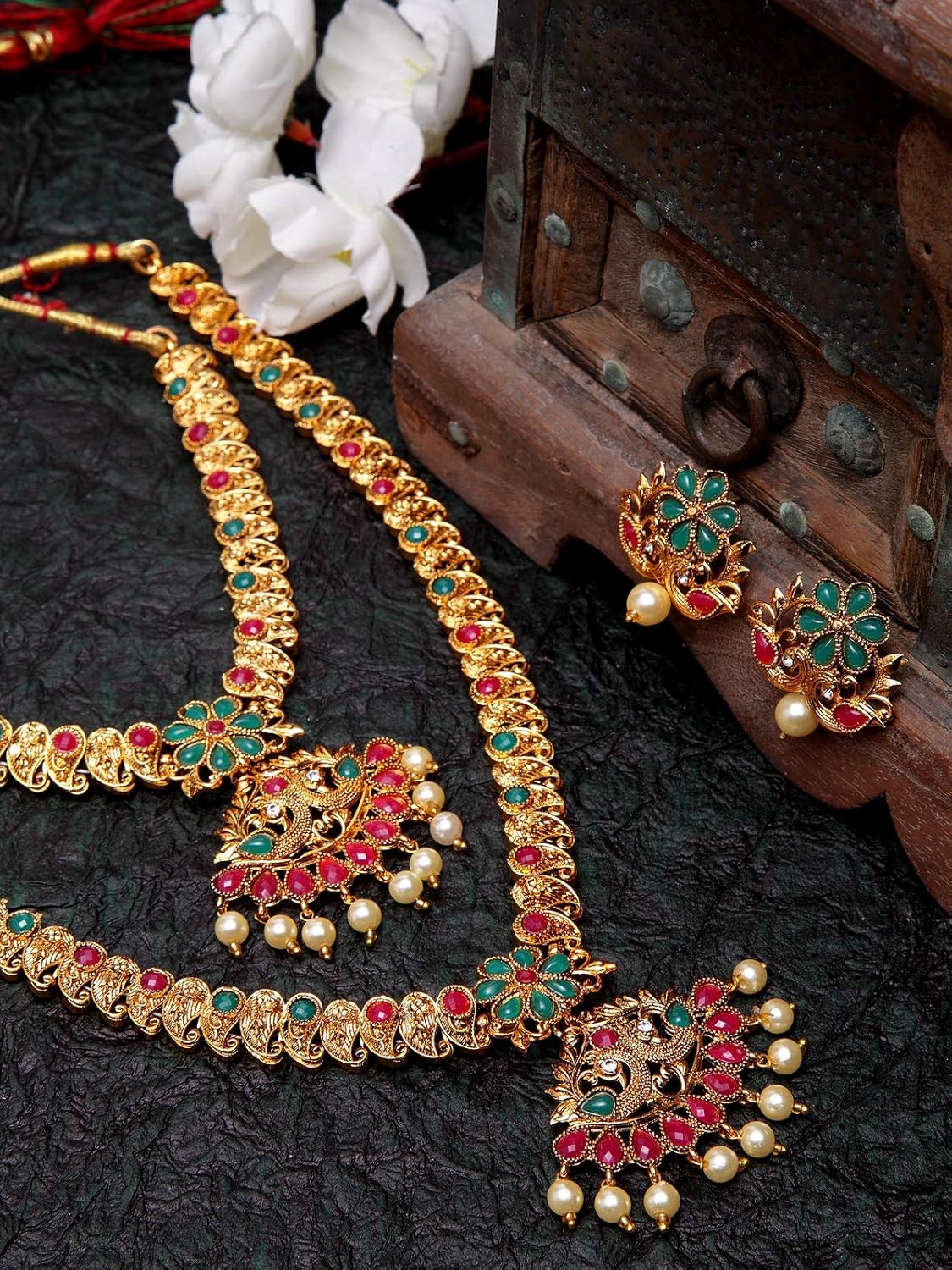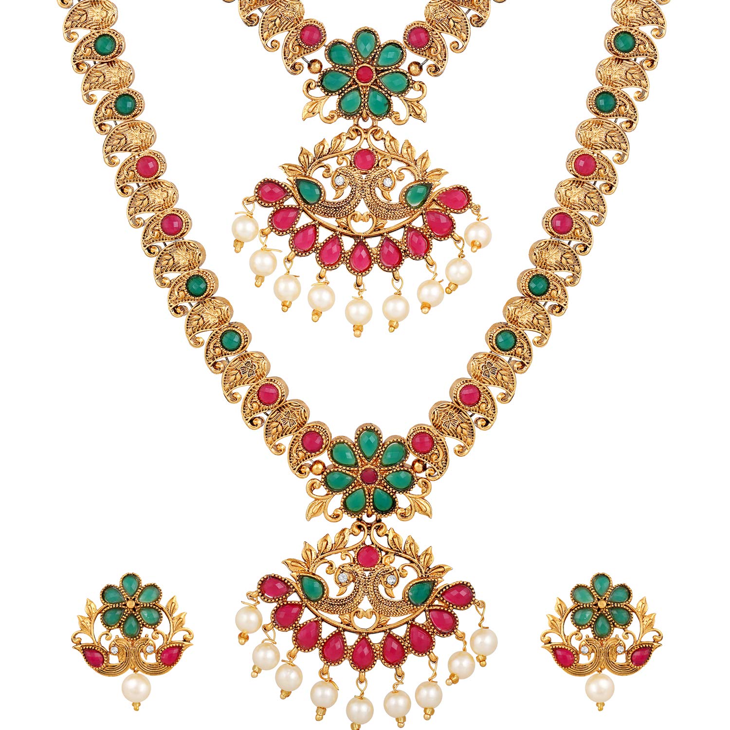 Shining diva presents this latest design jewellery set stylish gold plated necklace set for women. this wedding party wear long neckless set for women is made of high quality material which looks stylish and goes perfect with any attire. this jewellery set is perfectly suited for wedding or party wear. shining diva is a well known brand across fashion jewellery sector. shining diva has huge collection of latest statement haram necklace jewellery, traditional necklace set, south indian type lakshmi temple pendant set and other jewellery accessories which includes fancy bangles for women, wedding bangles, ear cuffs, traditional bangles kada, neck choker, fashion party wear necklace for girls and jhumki jhumka earrings. shining diva is pioneer of imitation jewellery and design pearl necklace set for women and american diamond hangings party wear stylish earrings. shining diva fashion and traditional jewellery give true value for your money. buy shining diva trendy artificial jewellery from amazon in offer. these are also ideal for special birthday gifts for girls, wife, love valentine gifts for girlfriend, wedding gifts and anniversary gifts.