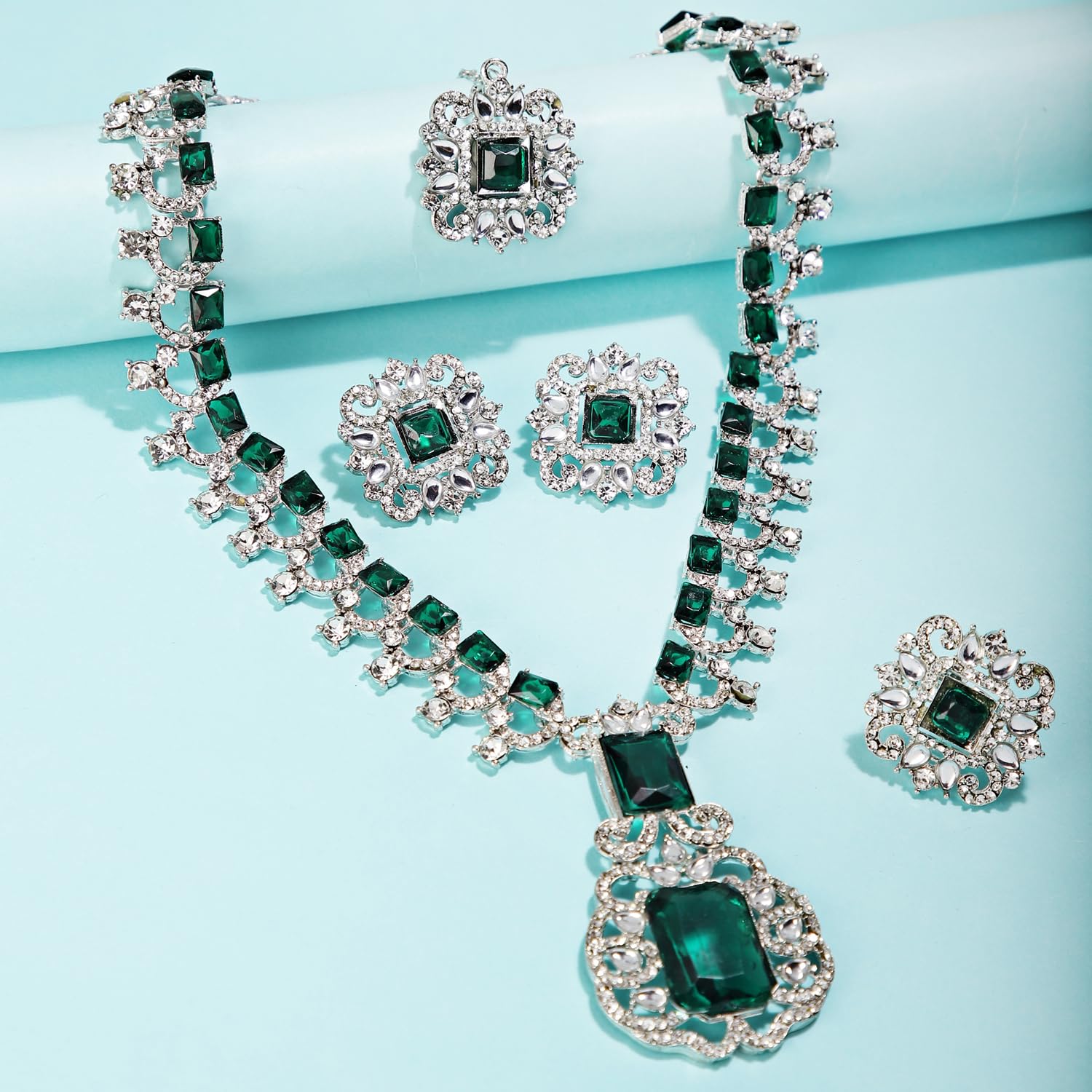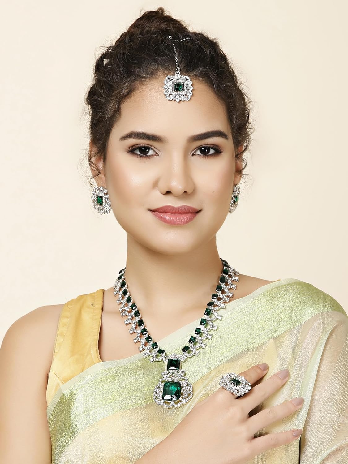 Shining Diva Fashion Nita Ambani Traditional Latest Stylish Design Jewelry Maang Tikka Ring Earrings Necklace Jewellery Set for Women (16072s) (Green)
