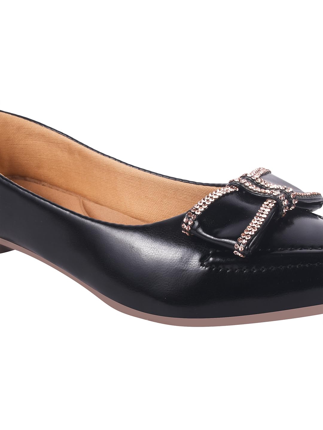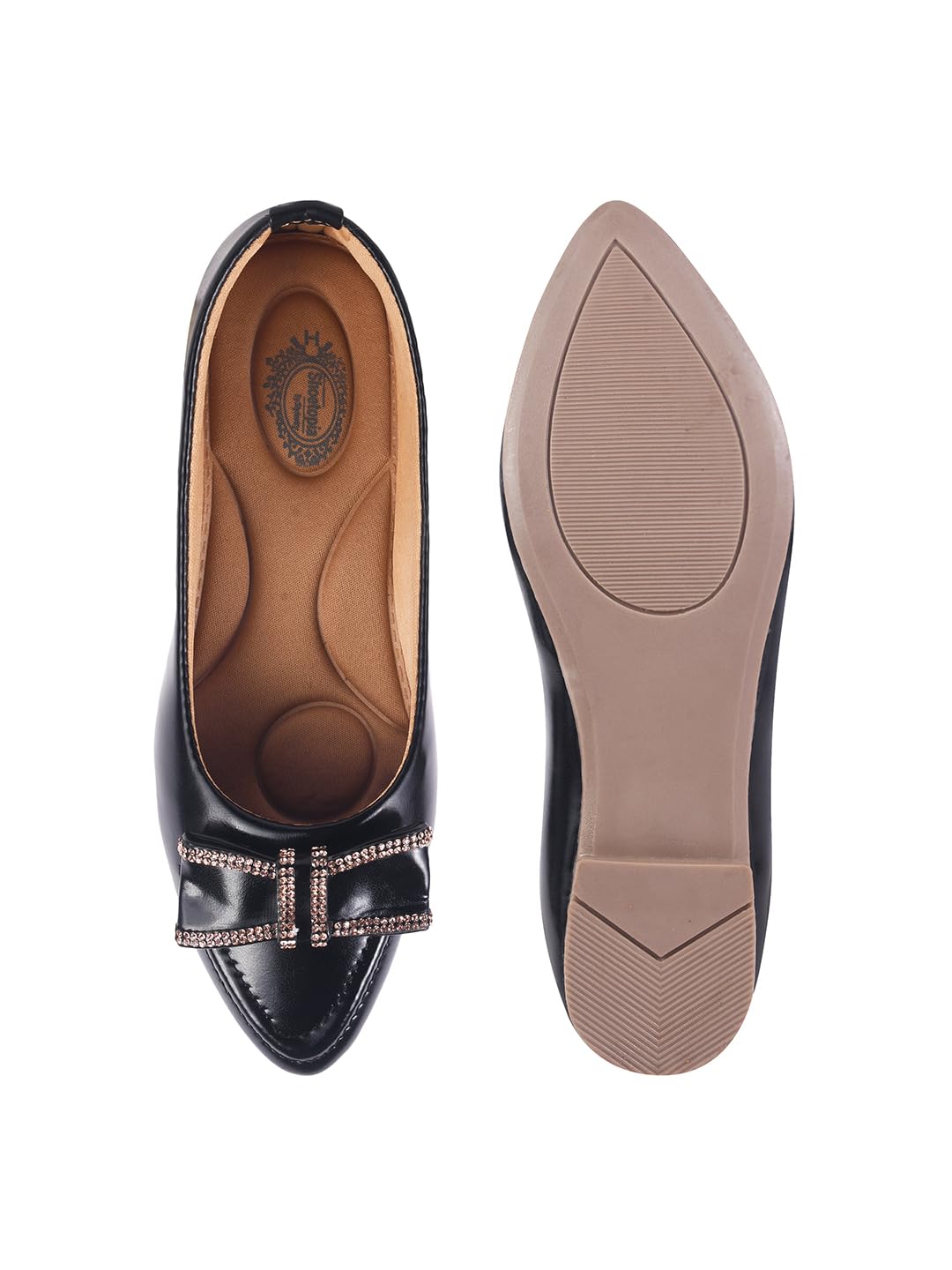 With Shoetopia Add a touch of elegance to your everyday style with these women’s ballet flats, designed to blend comfort and sophistication. Featuring a sleek pointed toe and adorned with a sparkling rhinestone bow, these shoes make a statement while remaining versatile for both casual and dressy occasions. The cushioned insole ensures comfort all day long, while the lightweight, durable sole provides stability with every step. Whether you’re heading to the office, a party, or a casual outing, these flats are the perfect finishing touch to your outfit.