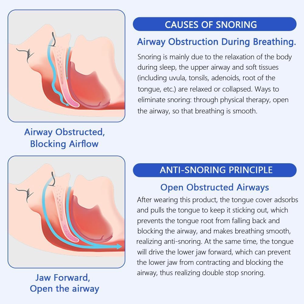 The uniquely designed tongue sleeve comfortably fits around the tip of your tongue, providing a secure and stable hold without excessive pressure. Its ergonomic form accommodates a variety of tongue sizes, ensuring a personalized and comfortable fit that stays in place all night long. By gently holding the tongue forward while you sleep, the tool prevents it from collapsing backwards and blocking the airway leading cause of snoring and obstructive sleep apnea. Crafted from food-grade silicone, this tongue stabilizing tool provides superior comfort and safety throughout the night. The soft and flexible material ensures it gently conforms to your tongues shape, minimizing irritation. For convenient and sanitary storage, each anti-snore tongue stabilizing tool comes with its own protective case. This ensures the device remains clean and dust-free between uses, making it ideal for both home use and travel. Unlike bulky CPAP machines or invasive surgical options, this tongue stabilizing tool offers an easy-to-use, non-invasive alternative for managing snoring and mild sleep apnea.