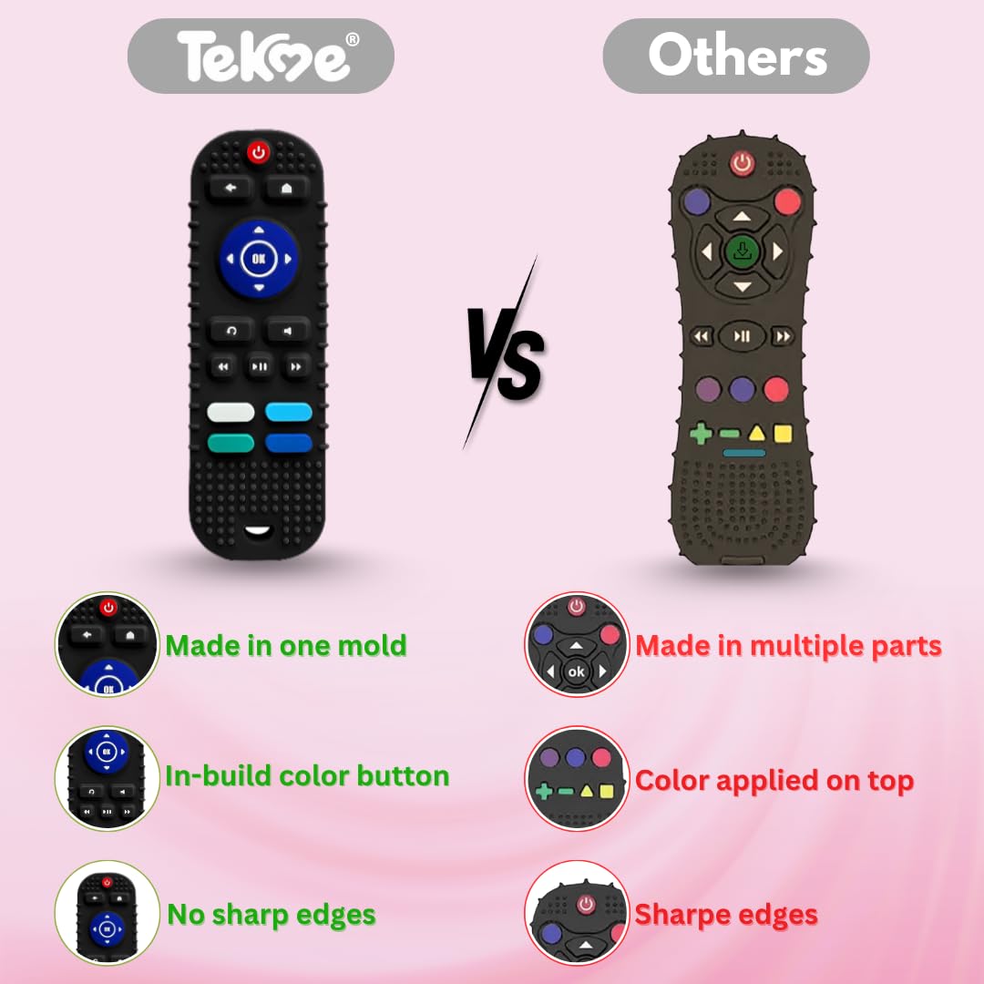 Realistic Design: Tekme teether toy, made of BPA-free silicone, is designed to look like a TV remote control, complete with 17 keys, making it the perfect chewing teether for 6 to 12 months baby and 1+ year old babies. It can also be used as a chewing tube for speech therapy.