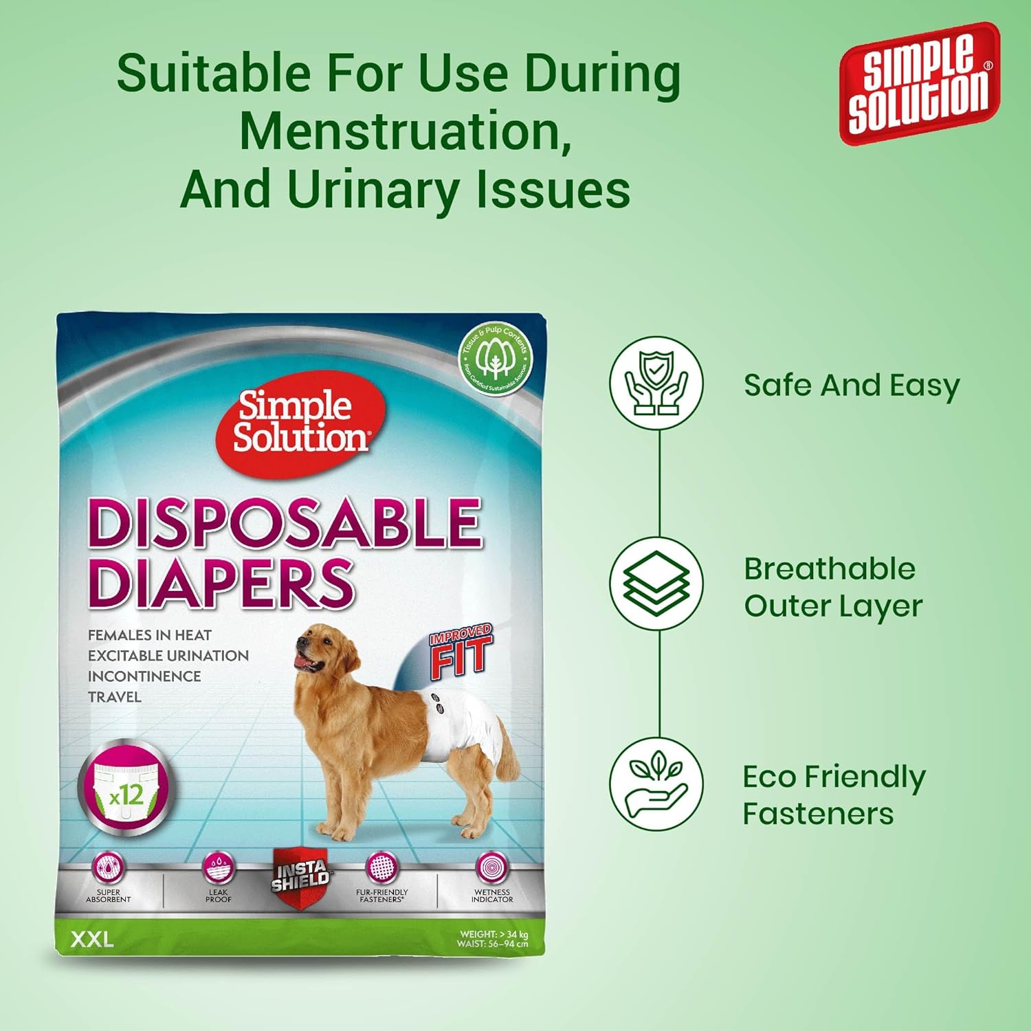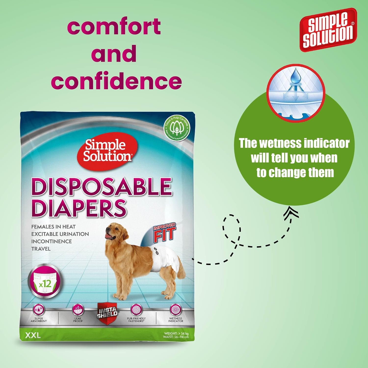 Simple Solution True Fit Disposable Dog Diapers for Female Dogs, Super Absorbent with Wetness Indicator, Leak Proof, Quickly Absorb Liquid for Long Lasting Dryness, XXL Size 56-94cm Waist (12 Pack)