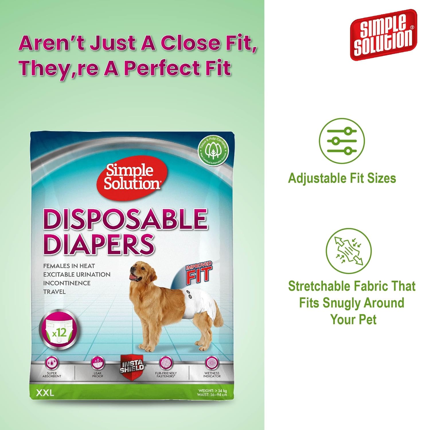 A BETTER FIT – Simple Solution Small Disposable Dog Diapers with new adjustable fit sizes are for female dogs with a Large-XXL 56-94cm waist. These female dog diapers feature a stretchable fabric that fits snugly around your pet.