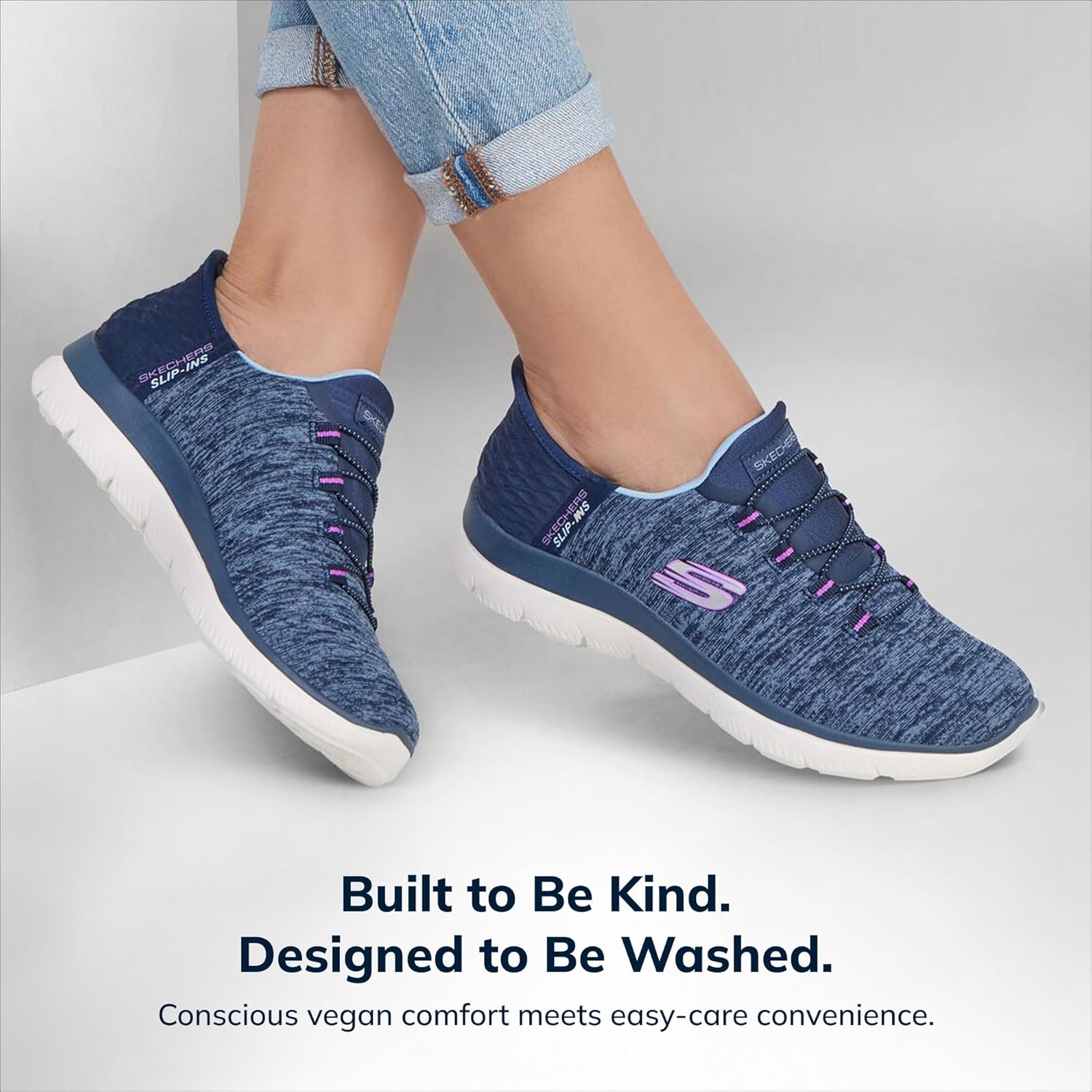 Skechers Slip-ins: Summits – Dazzling Haze with ease of wear and superior comfort. Designed with a unique Heel Pillow, this vegan style features a soft heather jersey knit upper with a fixed stretch shoelace, and cushioned Skechers Air-Cooled Memory Foam comfort insole.