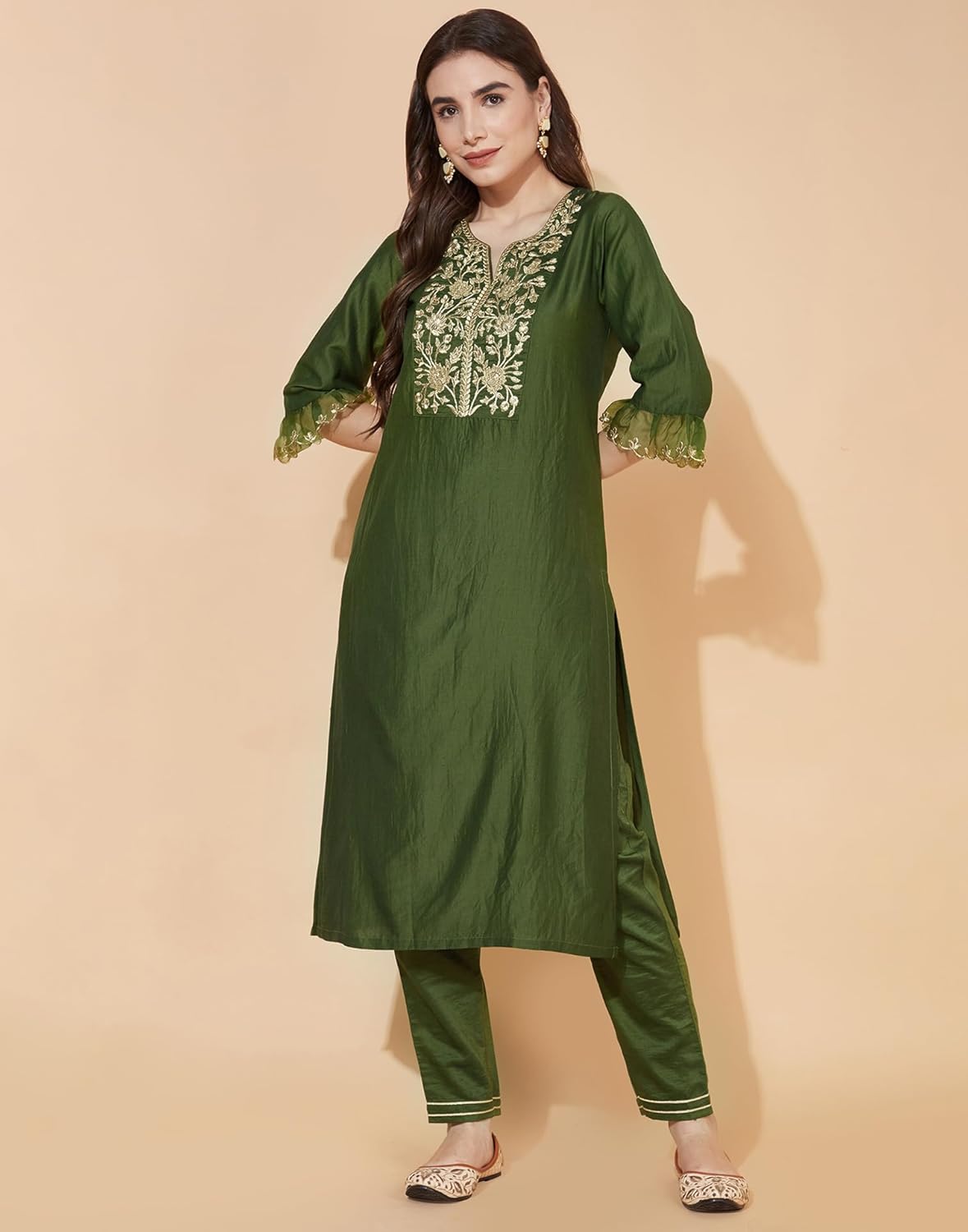SKYLEE Women’s Silk Blend Embroidery Straight Kurta with Pant & Dupatta