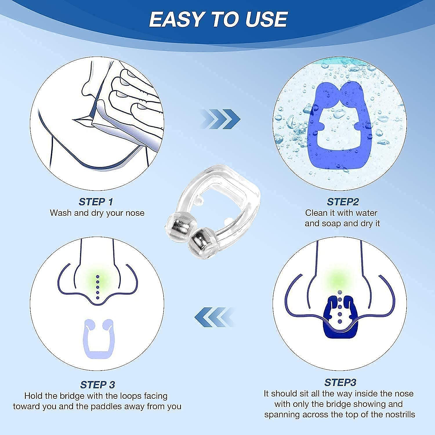 For the first time, use warm water to soak and clean the silicone magnetic nose clip before you wear it in your nose. Clean it after use too and put back to the case.
