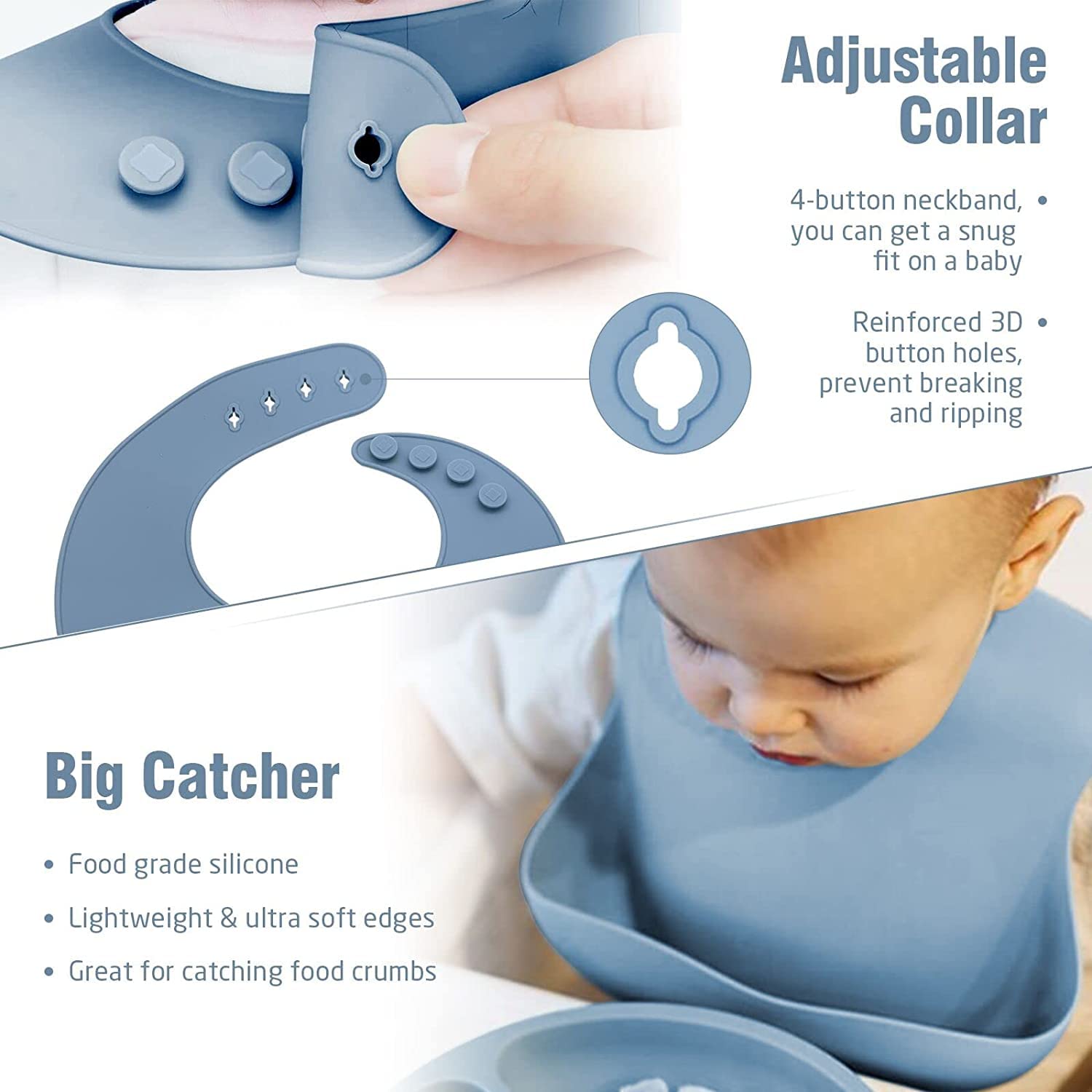 ✅ Adjustable Silicone & Cloth Bibs – Silicone bib with deep pocket prevents spills; the soft cloth bib provides added comfort and backup protection during messy meals.