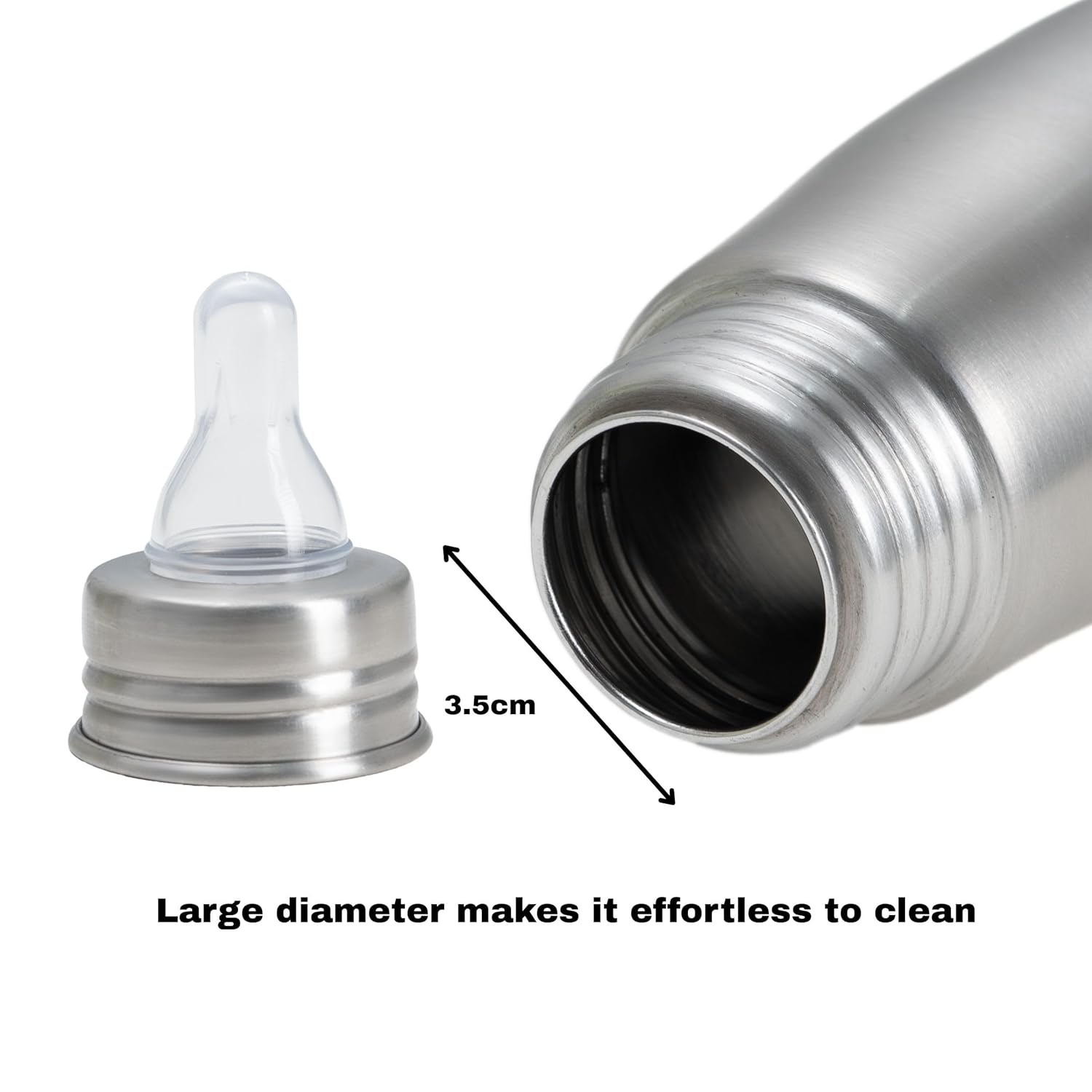 Comfort-Focused Steel Bottle for Baby This steel bottle for baby features a soft silicone teat that supports natural sucking motions, promoting an easy transition between breast and feeding bottle. Its ergonomic design ensures a comfortable grip for both babies and parents.