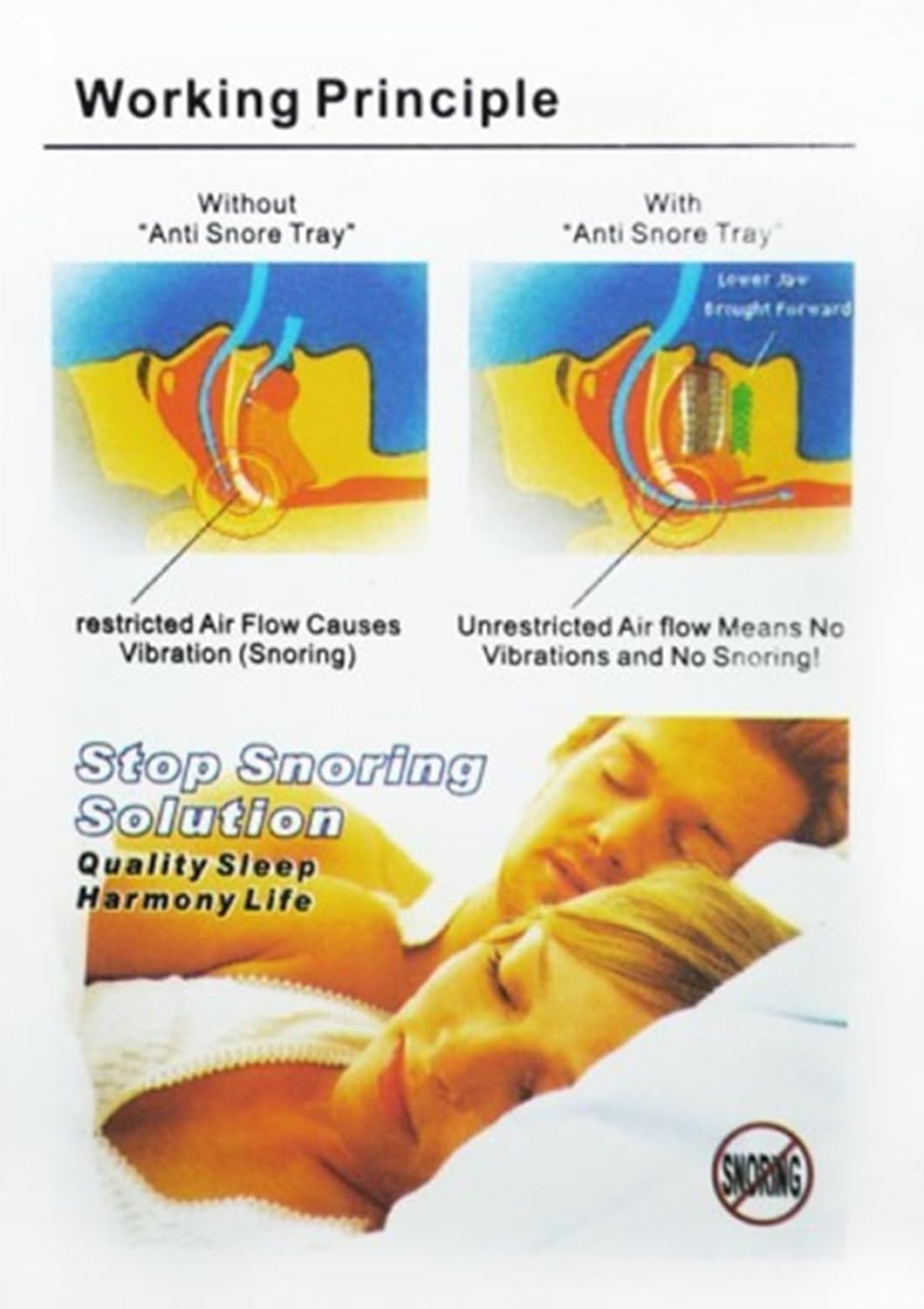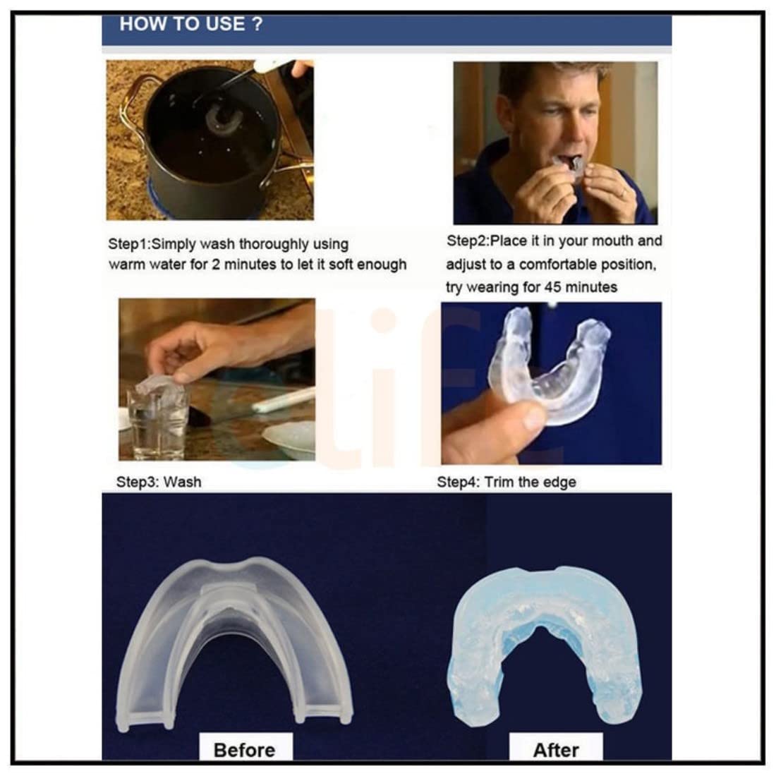 The Anti Snore Mouthpiece is an oral appliance worn at night for snore prevention and sleep apnea. The mouthpiece positions the lower jaw slightly forward during sleep. This widens the respiratory tract, enabling air to flow unobstructed through the breathing passage, which allows you to breathe more freely and stop snoring. The Mouthpiece also helps with Bruxism, a condition that causes you grind your teeth at night. Custom-Fit Instructions: 1. Clean the mouth guard thoroughly with cold water. 2. Boil water and remove from heat. Fill the pot with enough water so the mouth guard can be completely immersed. 3. Insert the mouth guard in to the hot water for 5-10 sec. The mouth guard will start to soften.(Don’t over heat). 4. Remove for water and allow the mouth guard to cool for a few seconds to prevent burning your mouth. When the mouth guard is cool enough place on to teeth and bite firmly on to the mouth guard and suck all the air from the mouth guard to get the tight fit. While sucking out the air use your fingers to apply pressure to the gums. 5. After the mouth guard has full cooled your mouth guard is ready. Care Instructions: Thoroughly clean the Mouthpiece with warm water after use and dry Store the Breathe-Easy Mouthpiece in the protective case to keep it safe, in its shape and sanitary until it’s next use. Health Benefits: If left untreated sleep apnea can result in growing number of health problems, some of them include: High Blood Pressure Heart Stroke Heart Failure, Irregular Heartbeats, Heart Attack Diabetes Depression Worsening of ADHD