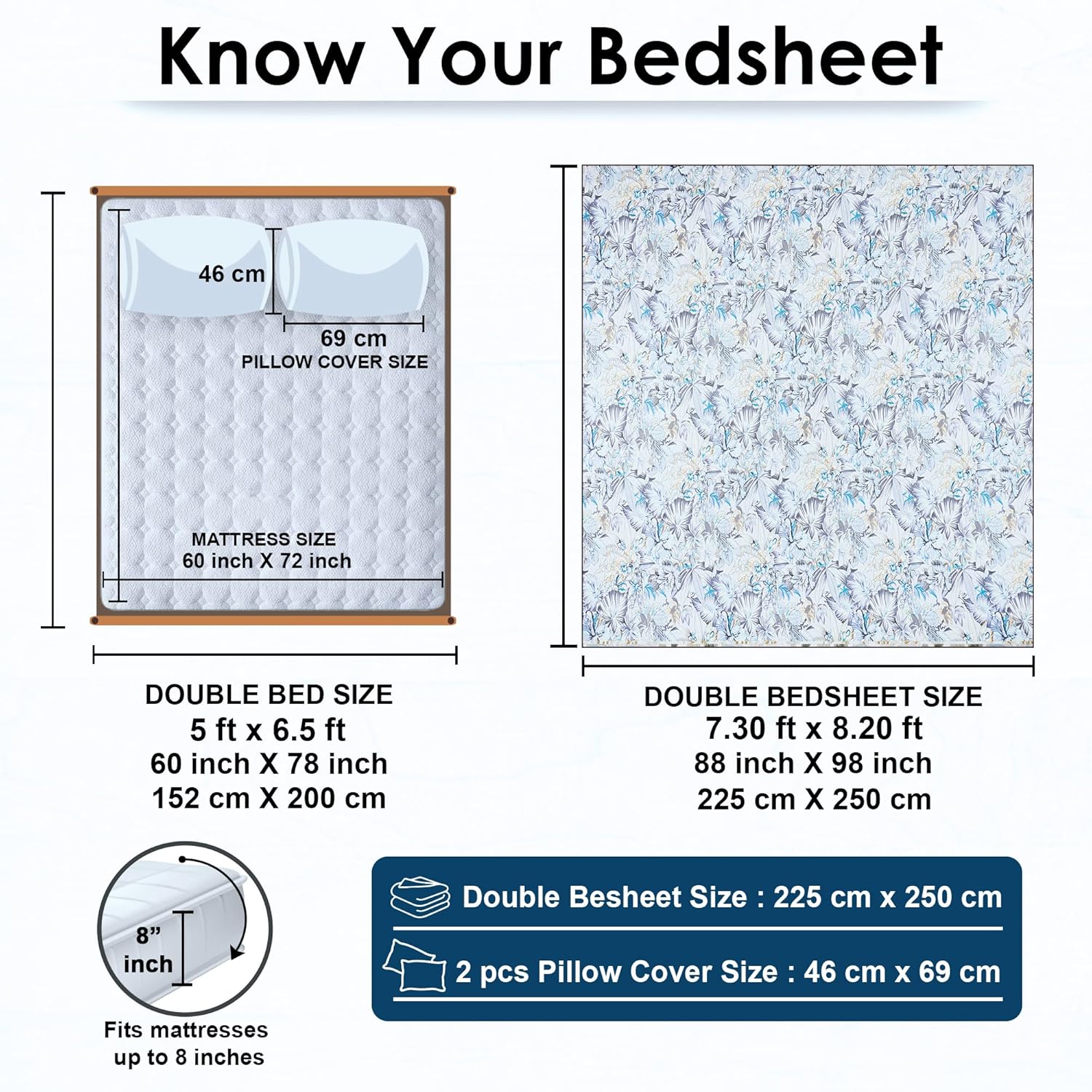 Care Instructions: Our bedsheet for double bed king size set is conveniently machine washable for easy cleaning. To maintain the integrity of the fabric, avoid using bleach or harsh chemicals. Additionally, refrain from exposing the sheets to high heat, as this can cause damage. This double bedsheet cotton set is designed for long-lasting use. We recommend avoiding strong detergents, bleach, tumble drying, and ironing on printed areas.