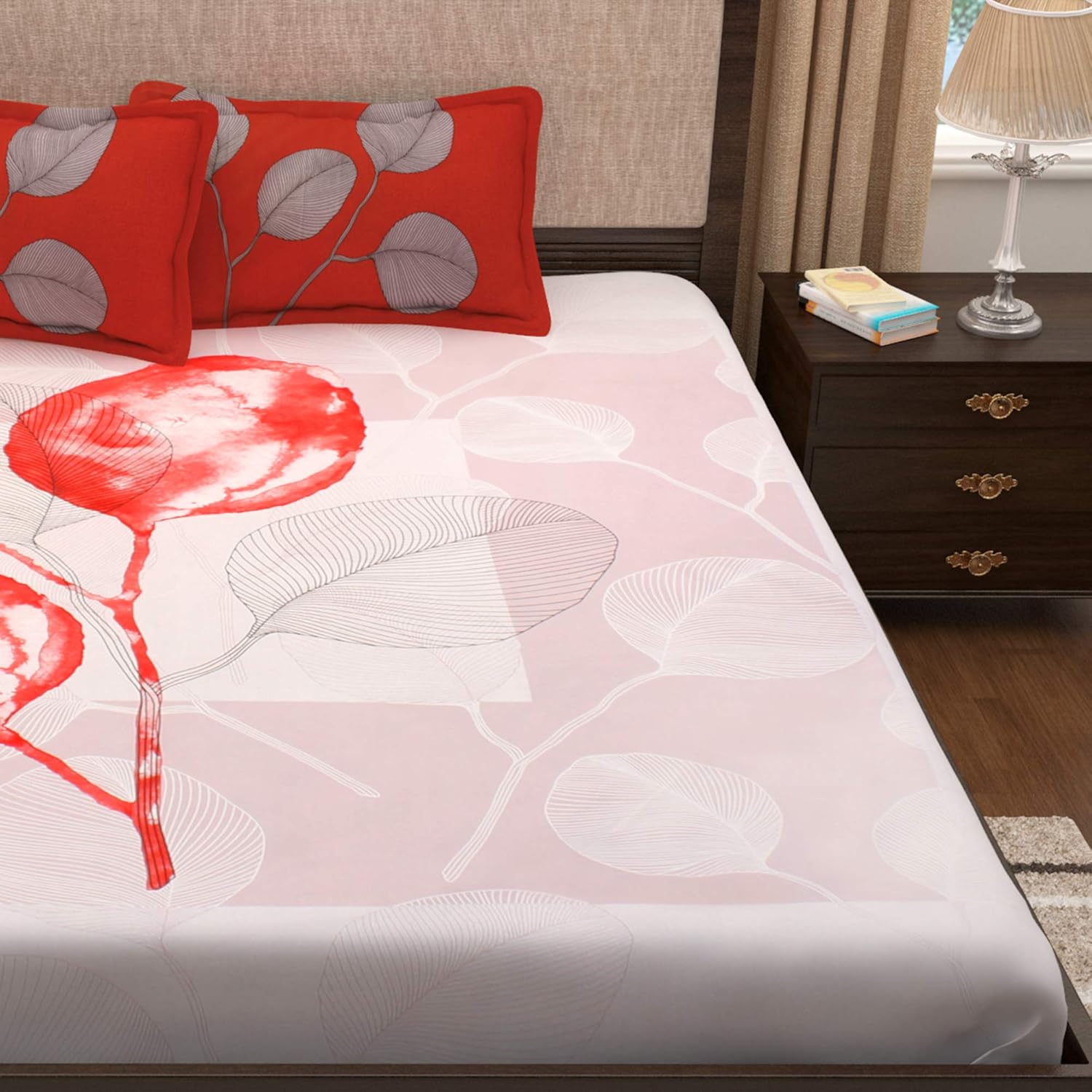 Material: 100% Cotton | Color: White & Red | Pattern: Floral | 300 TC. Enhance your sleep with our king size bedsheet cotton, designed to rejuvenate and energize you each morning. This bed sheet double bed is perfect for ensuring a good night’s sleep, adding a touch of elegance to your bedroom. Our King size bed sheet boasts a soft, breathable texture. Ideal for a king size bedsheets & Bedsheet for double bed
