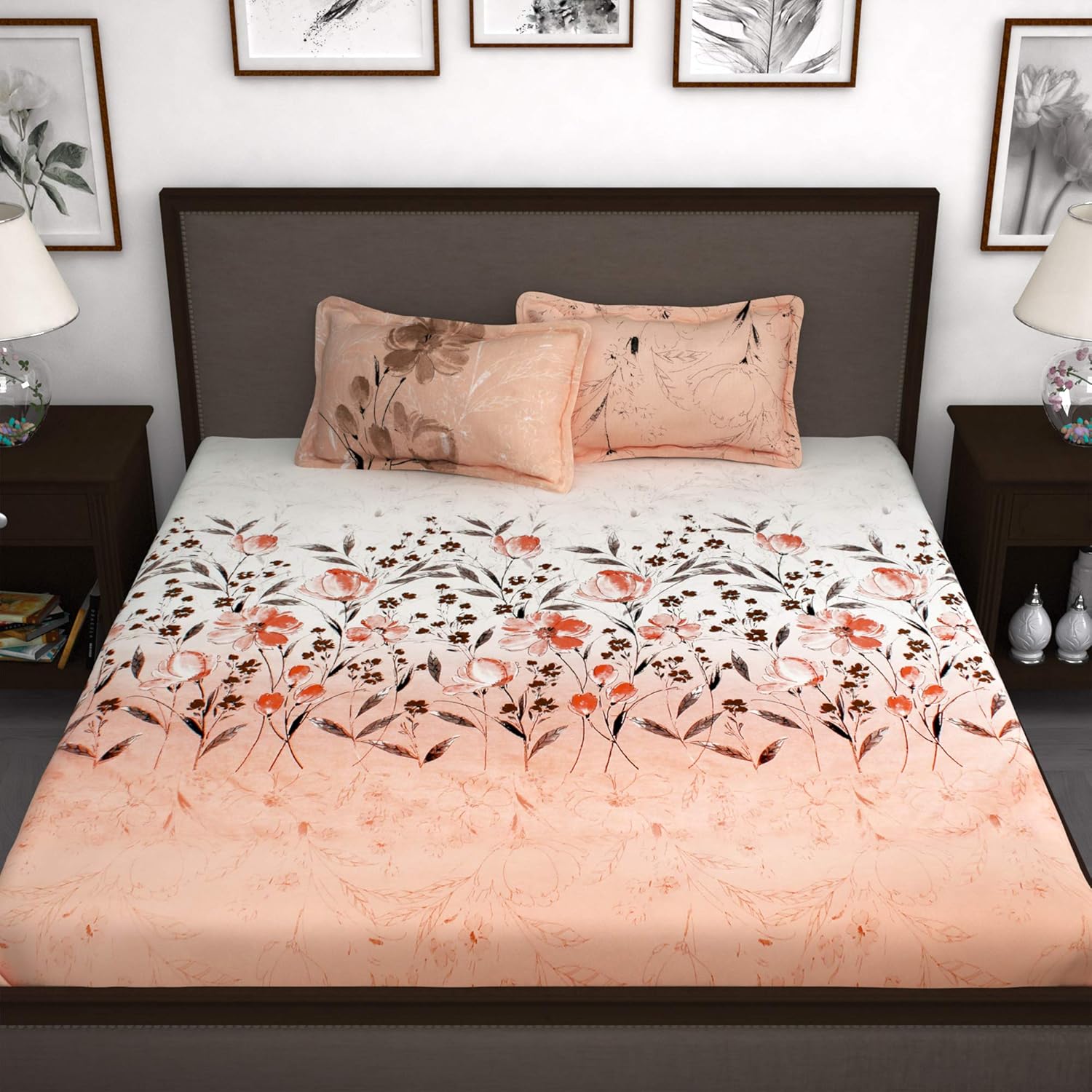 Story@Home Bedsheet for King Size Bed | Cotton Bedsheet | Floral King Size Bed Sheet with 2 King Size Pillow Covers (270 X 270 Cm, Peach) | Perfect for Diwali Gifting/Festive Gifting | 240TC