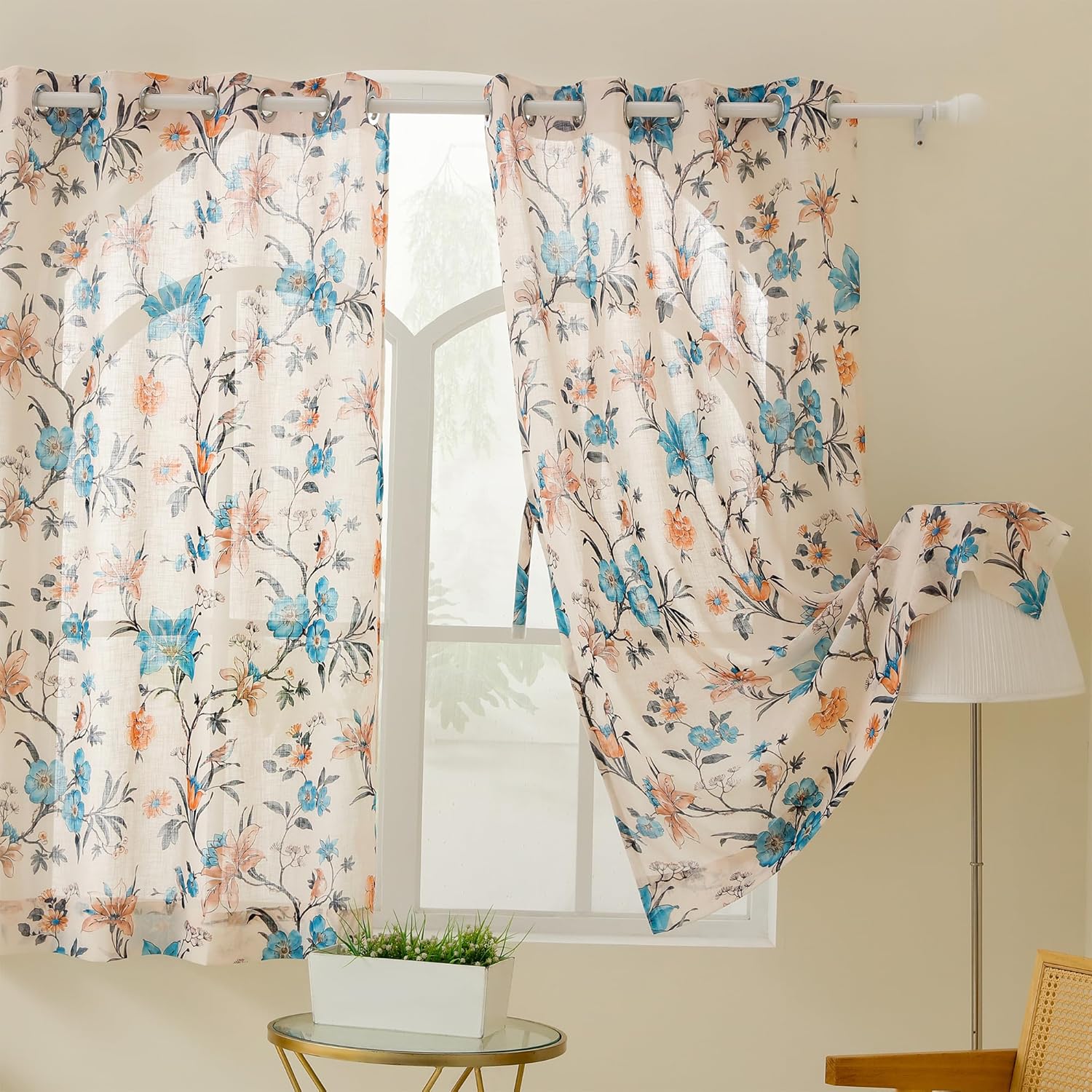 Story@Home Window Sheer Curtains 5 Feet Set of 1 | Floral Printed | Semi Transparent Curtain | Net Curtains | Curtain for Living Room | (118 x 152 cm, Cream & Blue) | Perfect for Home Decor