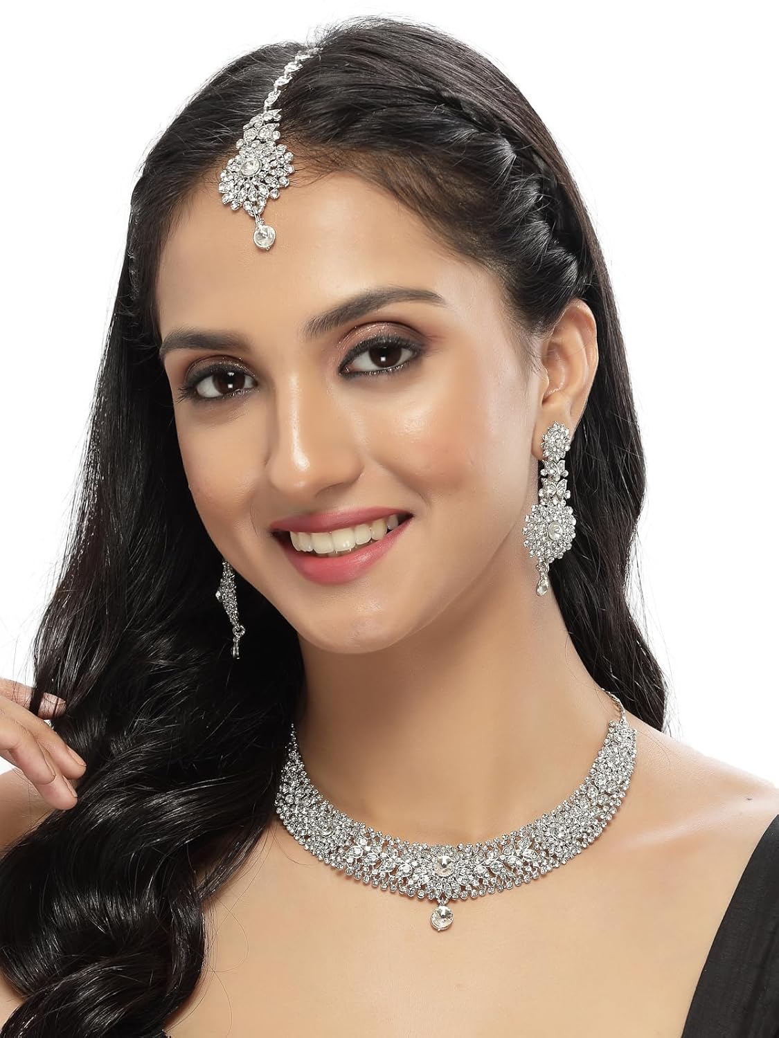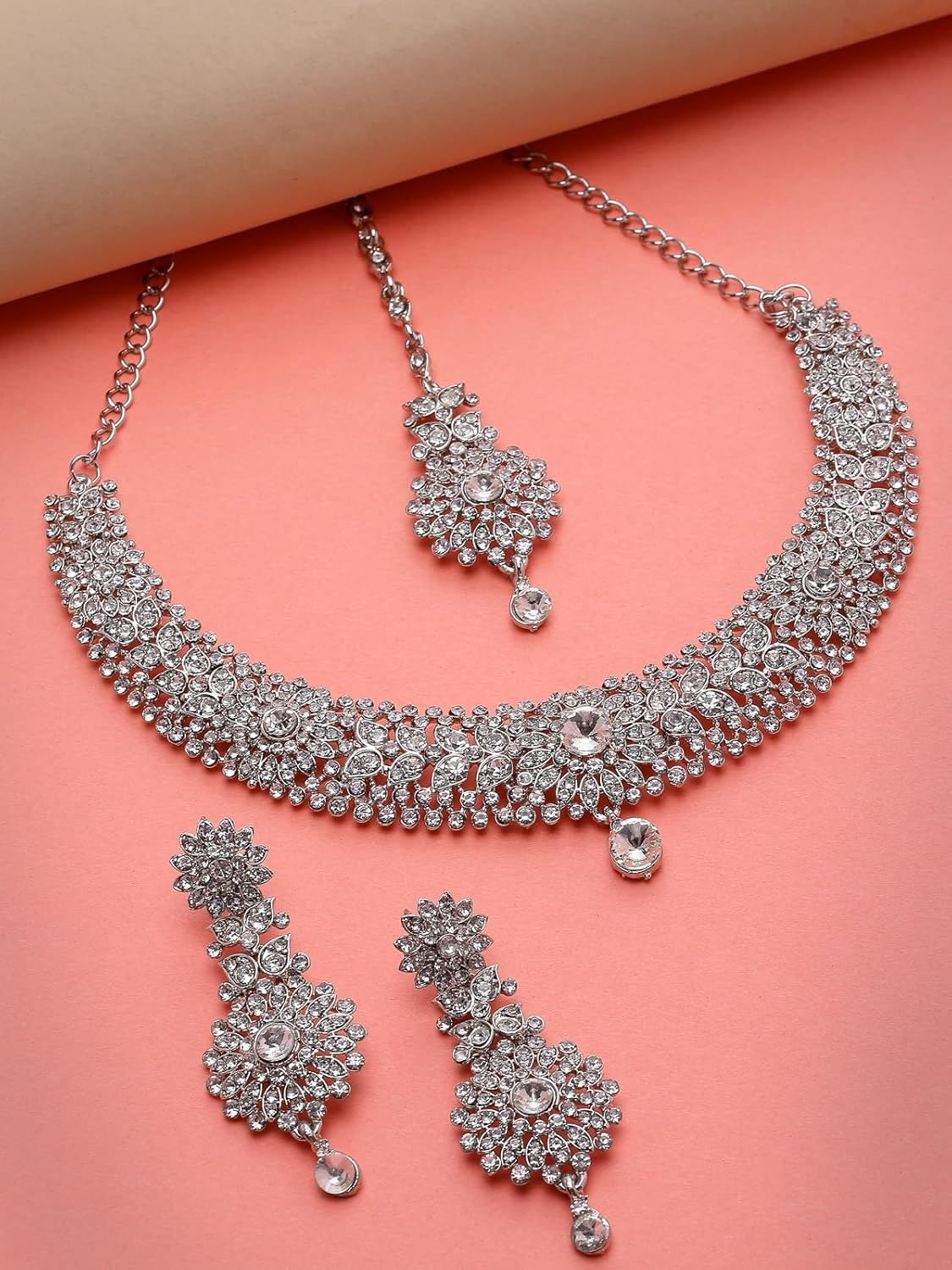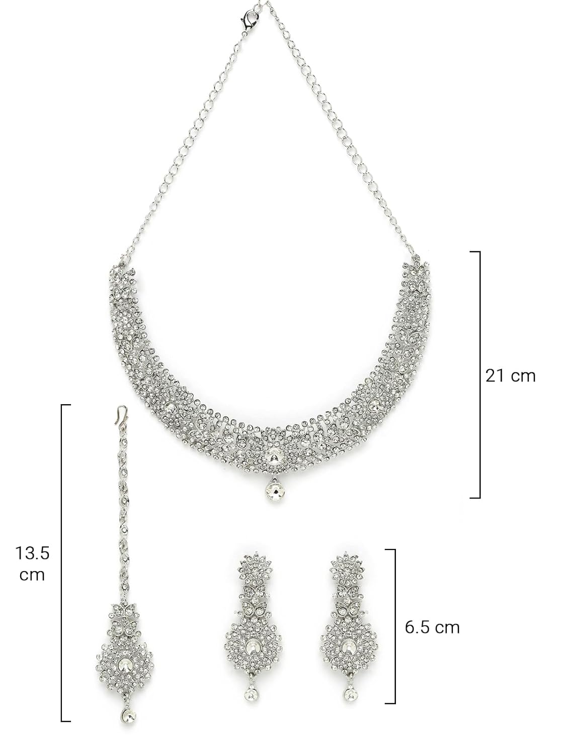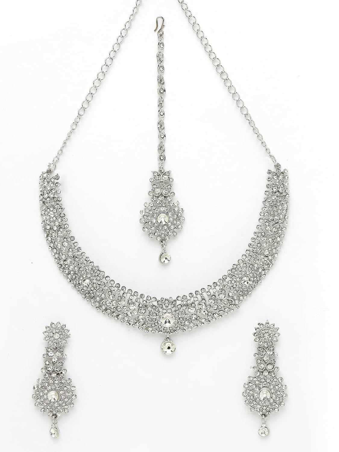 Sukkhi Fashion Rhodium Plated Silver AD White Stone Collar Bone Necklace Set With Earring And Maangtika | Jewellery Set For Women (NS105671)