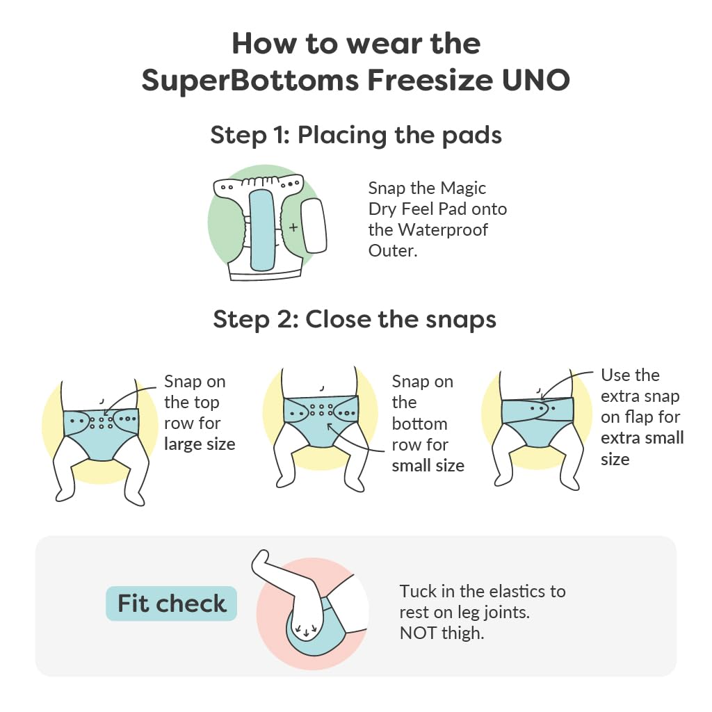 ♥️SuperBottoms, Made In India With Love: SuperBottoms, proudly Made In India, is the trusted choice of over 20 lakh+ parents for Zero Compromise Baby Care. The UNO Cloth Diapers feature a patent-pending [SnapEasy/ SmartFastening] system. SuperBottoms is also backed by none other than Mega Star Alia Bhatt herself in 2023. If you face any issues, feel free to reach out to our MomsConnect Team. We cater to 500 queries daily and our team speaks in 11 languages!