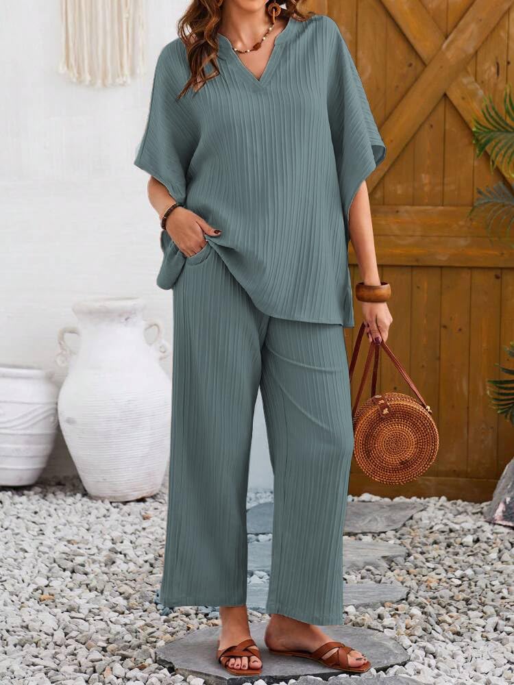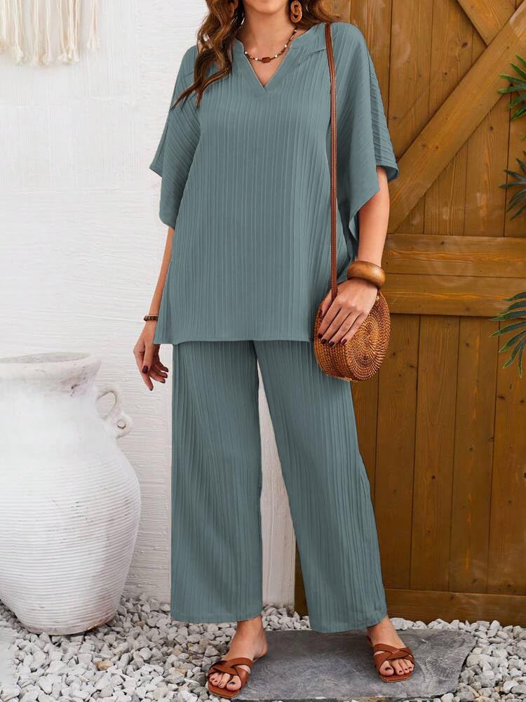 TADKEE Women’s Solid Color V-Neck Kaftan Sleeve Casual Wear Co ord Set | Kurta Set for Women