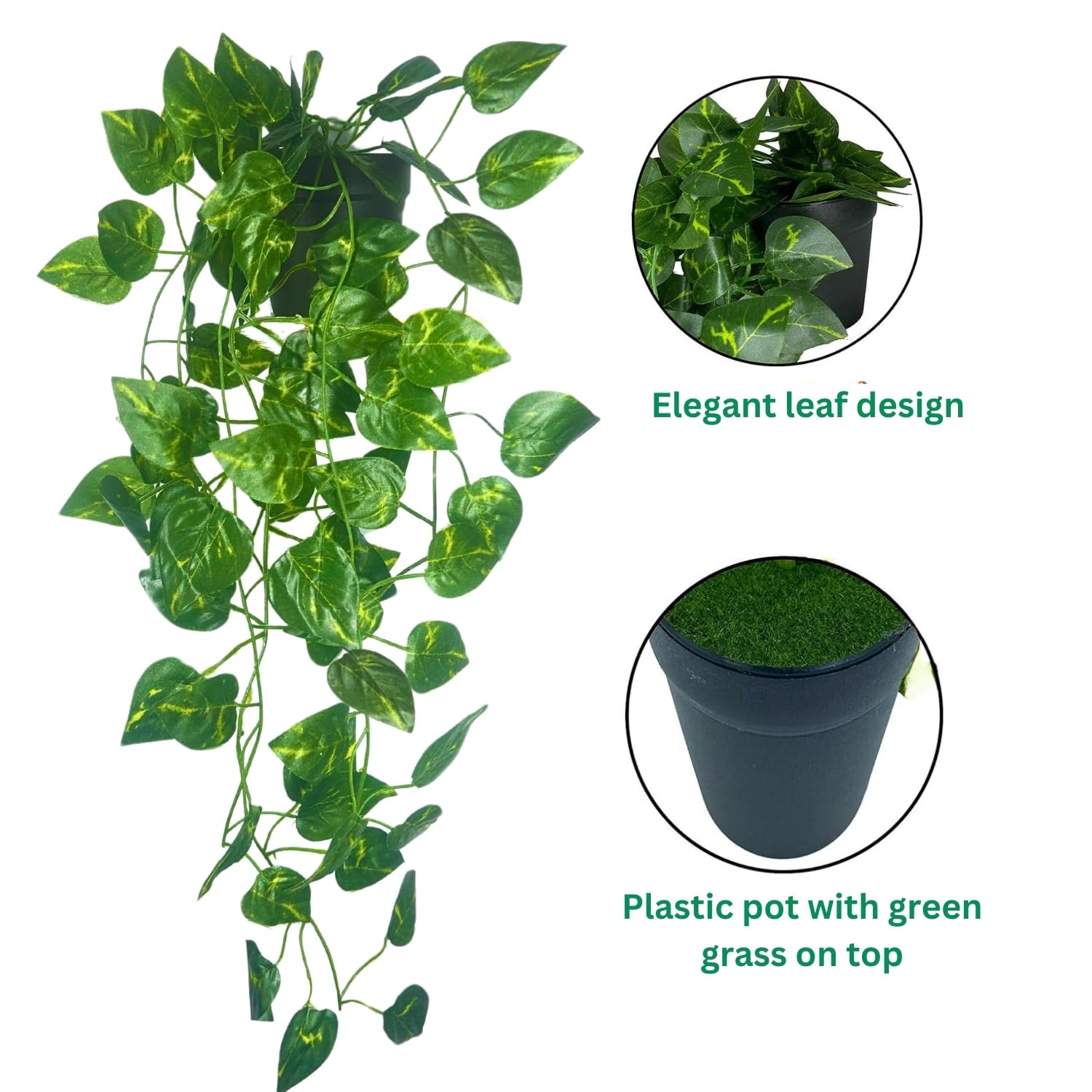 Box contain 2 pcs artificial hanging plants with Pot. Each pot contains 10 creepers, they measure approximately 30 – 50 cm. Each ivy creeper contains several leaves.