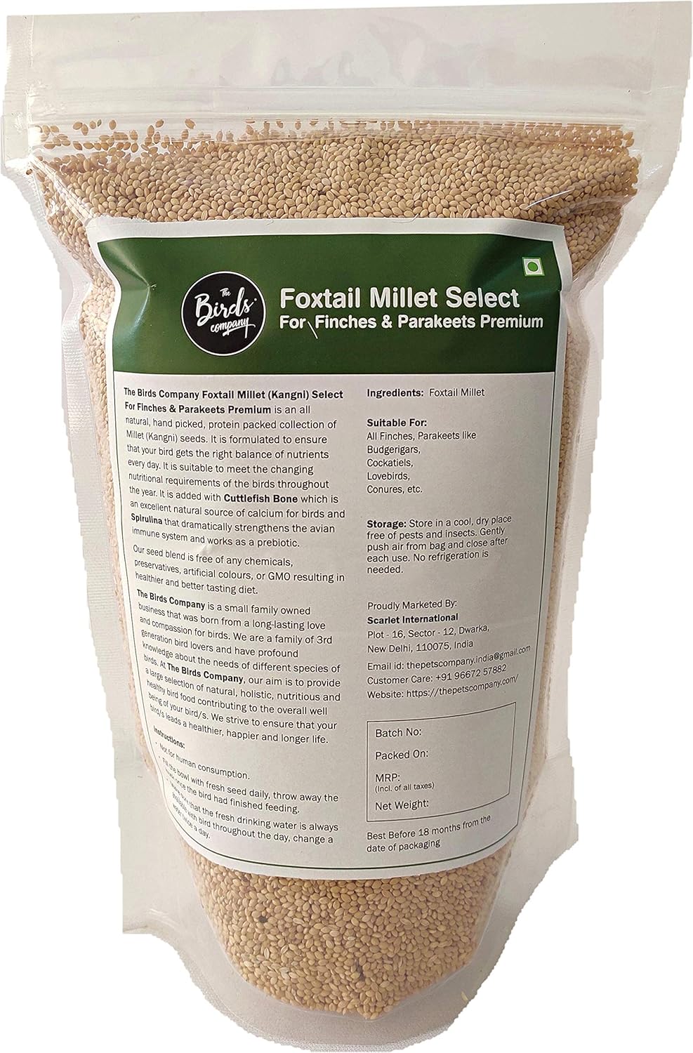 At The Birds Company, we’re passionate about providing safe, nutritious, and natural foods for our feathered companions. Our Foxtail Millet is sourced responsibly and packaged with love — because your birds deserve the best.