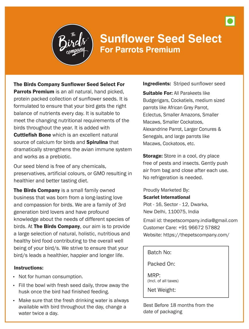 The birds company sunflower select for parrots premium is a all natural, hand picked, protein packed collection of sunflower seeds. It is formulated to ensure that your bird gets the right balance of nutrients every day. It is suitable to meet the changing nutritional requirements of the birds throughout the year. It is added with cuttlefish bone which is an excellent natural source of calcium for birds and spirulina that dramatically strengthens the avian immune system and works as a prebiotic. Our seed blend is free of any chemicals, preservatives, artificial colours, or gmo resulting in healthier and better tasting diet. The birds company is a small family owned business that was born from a long-lasting love and compassion for birds. We are a family of 3rd generation bird lovers and have profound knowledge about the needs of different species of birds. At the birds company, our aim is to provide a large selection of natural, holistic, nutritious and healthy bird food contributing to the overall well being of your bird/s. We strive to ensure that your bird/s leads a healthier, happier and longer life. Ingredients: Striped sunflower seed. Suitable for: All parakeets like budgerigars, cockatiels, medium sized parrots like African grey parrot, eclectus, smaller amazons, smaller macaws, smaller cockatoos, alexandrine parrot, larger conures and senegals, and large parrots like macaws, cockatoos, etc. Instructions: Not for human consumption. Fill the bowl with fresh seed daily, throw away the husk once the bird had finished feeding. Make sure that the fresh drinking water is always available with bird throughout the day, change a water twice a day. Storage: Store in a cool, dry place free of pests and insects. Gently push air from bag and reclose after each use. No refrigeration is needed.
