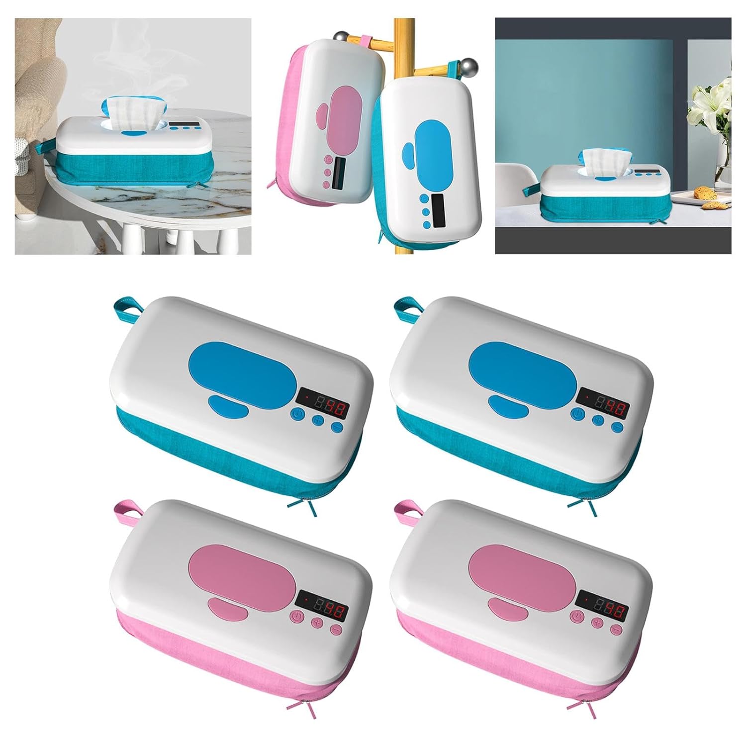 HOW TO USE: 1. Unzip the wipe warmer canvas. 2. Fix the wet wipes that have been torn off with the elastic straps of the heating cover. 3. Close the zipper, and adjust the temperature. 4. After reaching the set temperature, press the pick up buttons, the cover automatically pops up and can be used.