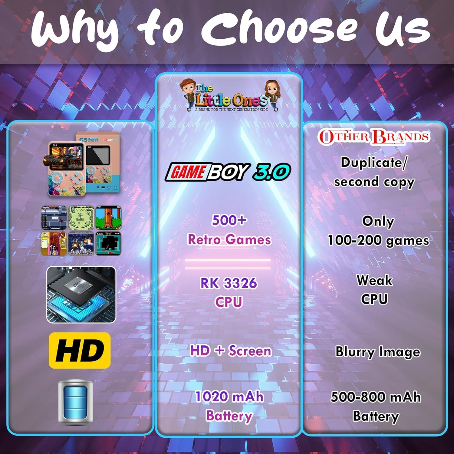 [Immersive 3-Inch HD Display with Backlit Functionality]- Experience gaming like never before with the GAME-B0Y 3.0’s crystal-clear 3-inch high-definition digital display.The vibrant colors, sharp details, & smooth graphics create an immersive visual experience that enhances every game you play.Thanks to the built-in backlight feature, you can enjoy seamless gameplay anytime, anywhere.The GAME-B0Y 3.0’s screen ensures every pixel pops with clarity, bringing retro games to life with stunning visuals.