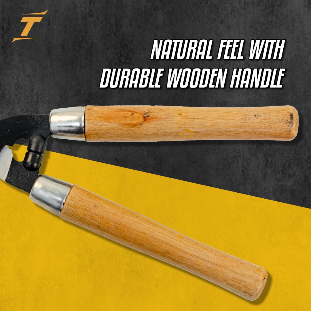 This hedge shear features a high-carbon steel blade with Teflon coating for sharp, rust-resistant performance. The ergonomic wooden handle, tension control knob, and shock-absorbing bumpers ensure comfort and precision with every cut.