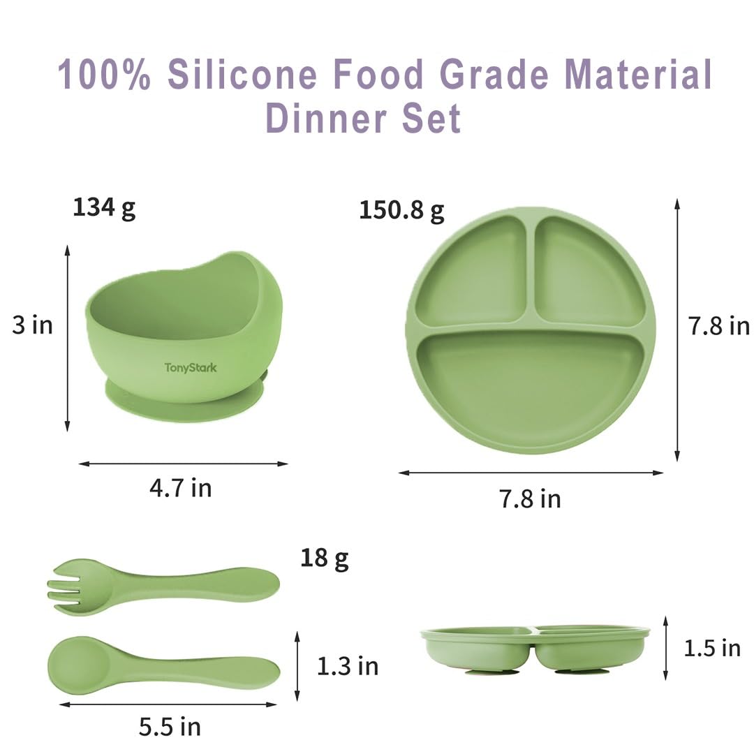 Tony Stark Feeding Set, Silicone Tableware Kit for Baby, Bowl, Fork, Spoon & Suction Plates (Green)