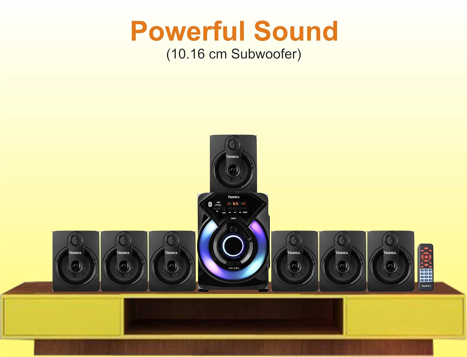 TRONICA Series 7.1 Channel Home Theater System Bluetooth, USB, FM, SD, AUX, RCA Inputs, LED TV Compatible, 4″ Active Subwoofer, 3″ Passive Radiator, Vivid Lighting, Wireless Remote