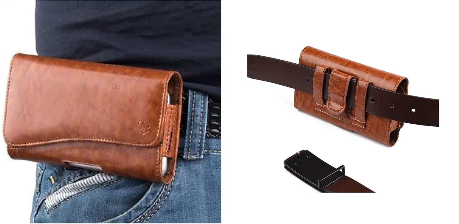 This Belt Pouch is a Universal Long Lasting Leather Carry Case Cover Pouch With Hidden Magnetic Closure For Closing The Case.Perfect Fit For Travel And Carrying Your Mobile On Bike.Wear Your Phone Sideways On Your Belt And Always Have It At Your Reach. It has a Leather Wrapped Metal Clip And Also A Belt Loop In Case You Want That Extra Security.