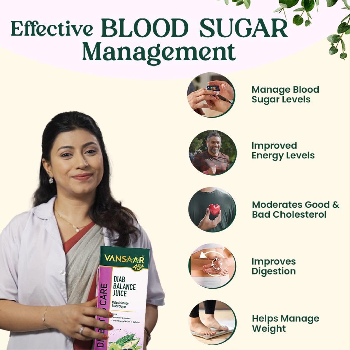 Vansaar 45+ Diab Balance Juice is formulated esp. for diabetic & pre-diabetic 45 & above adults with all-ayurvedic ingredients to support in effective diabetes care. Beyond the benefits of Karela and jamun that effectively aid in blood sugar management, Vansaar 45+ Diab Balance juice stands out as the 1st ever juice uniquely crafted in the right proportion, incorporating the goodness of 14 powerful Ayurvedic ingredients to effectively manage blood sugar levels thereby making it the best ayurvedic medicine for diabetic care. The natural ingredients of this diabetic care juice help reduce cholesterol levels and improve heart health. Consuming Vansaar 45+ Diab Balance Juice everyday helps manage blood sugar levels & related complications naturally!