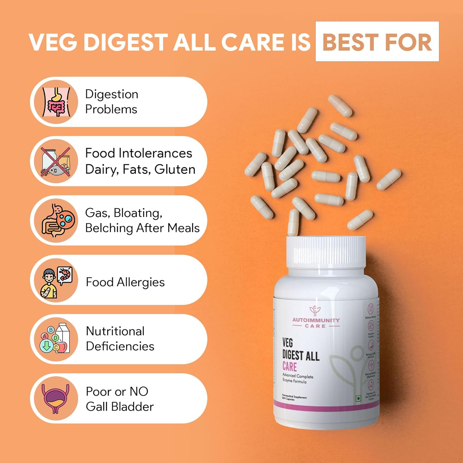 Veg Digest All Care – Advanced Digestive Enzymes, Multi Enzyme Amylase (Carbohydrate Digesting), Prevents Indigestion, Bloating, Gas & Discomfort. | 30 Veg capsules