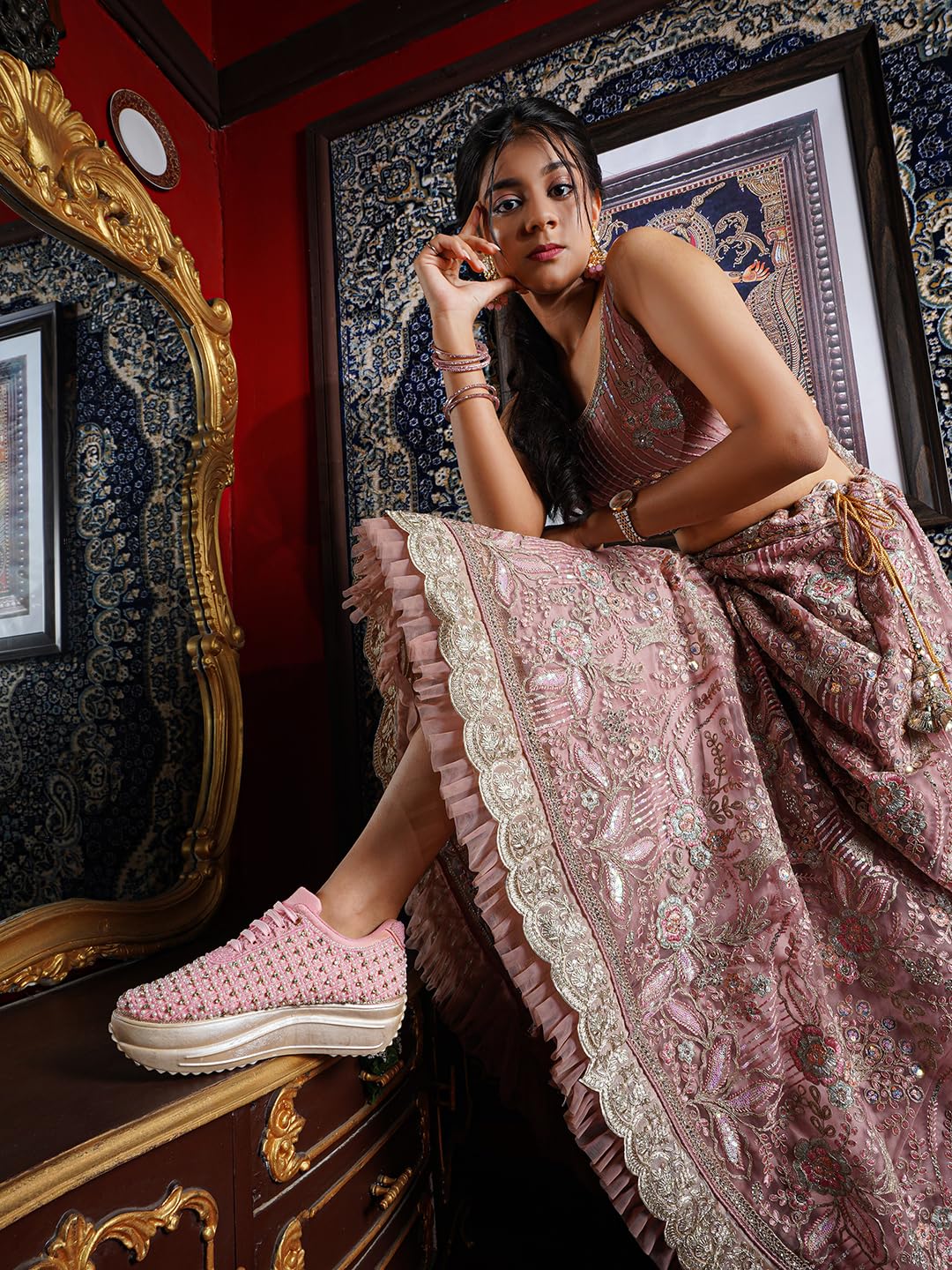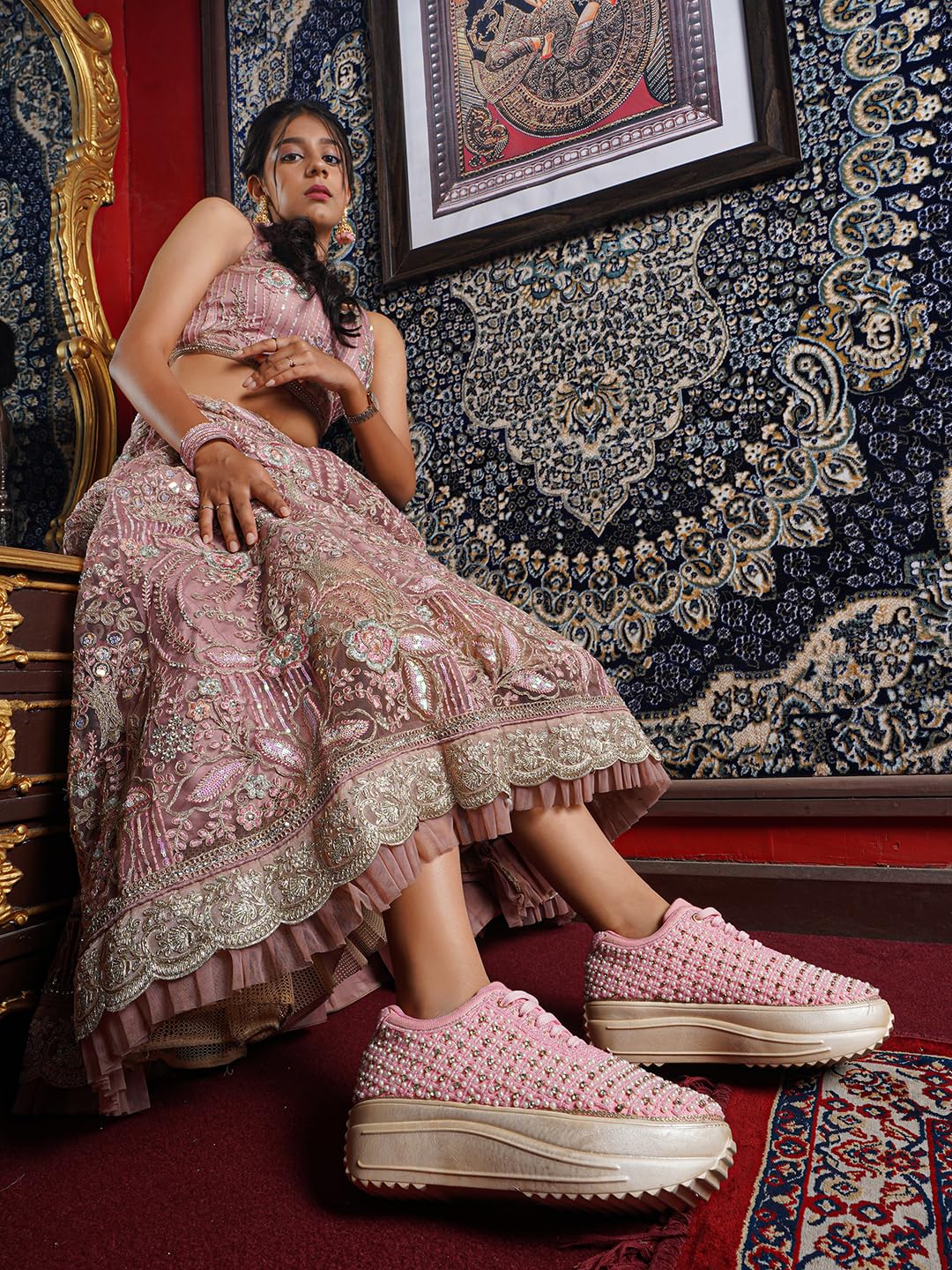 Our Women’s Wedding Sneakers are the perfect blend of bridal elegance and all-day wearability. Designed for traditional & modern brides, bridesmaids, or wedding guests who want to dance the night away, these sneakers pair beautifully with lehengas, gowns, dresses, and reception looks.