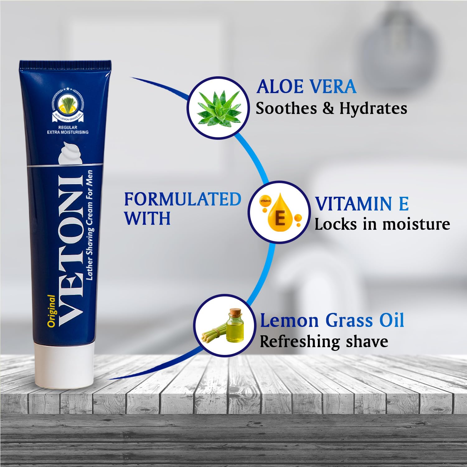 .Vetoni Shaving Cream delivers intense hydration with aloe vera and lemongrass oil leaving skin deeply moisturized smooth and refreshed after every luxurious shave.