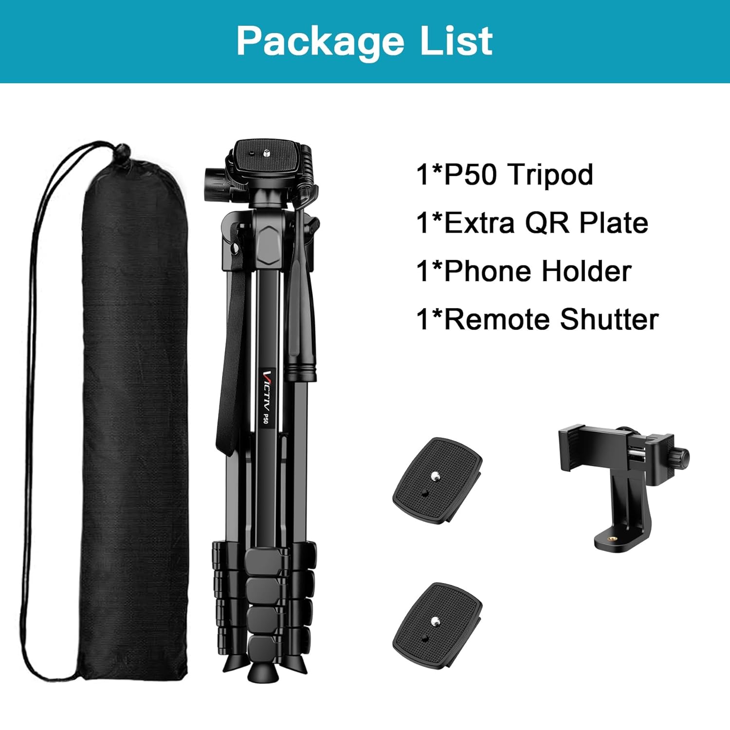 Package Listing: The package includes P50 tripod stand * 1, quick release board * 2, phone clip * 1, manual * 1, travel bag*1. We offer a 1-year after-sales service commitment. If you experience any issues due to product quality, simply contact us — we will take full responsibility for all repairs and replacements.