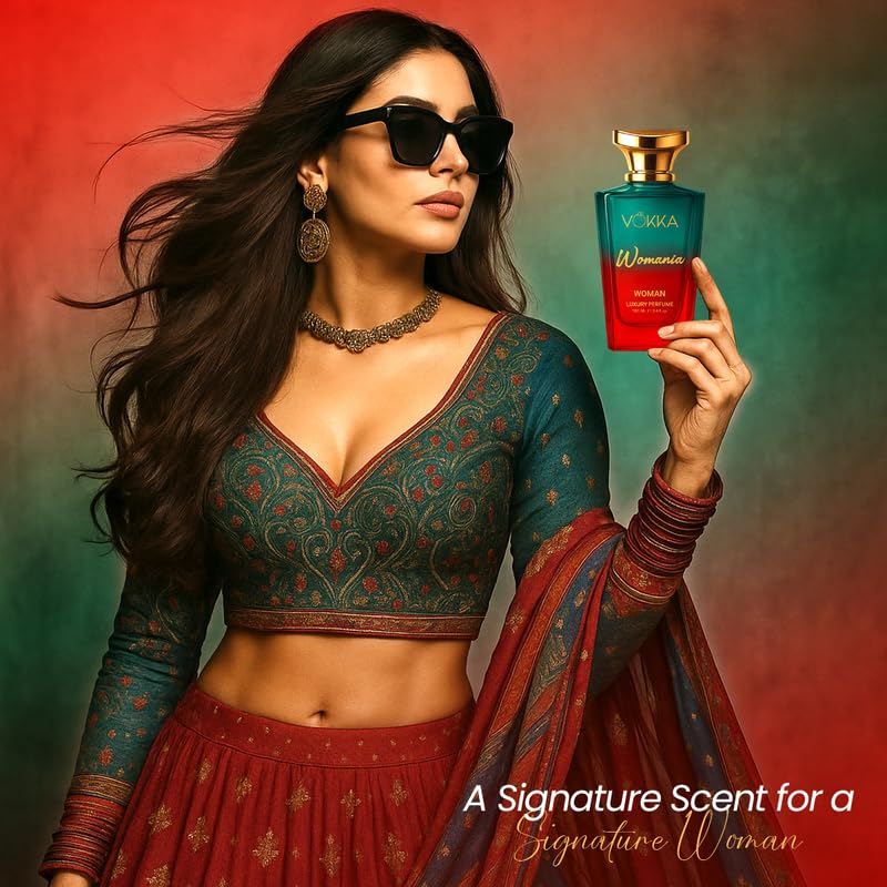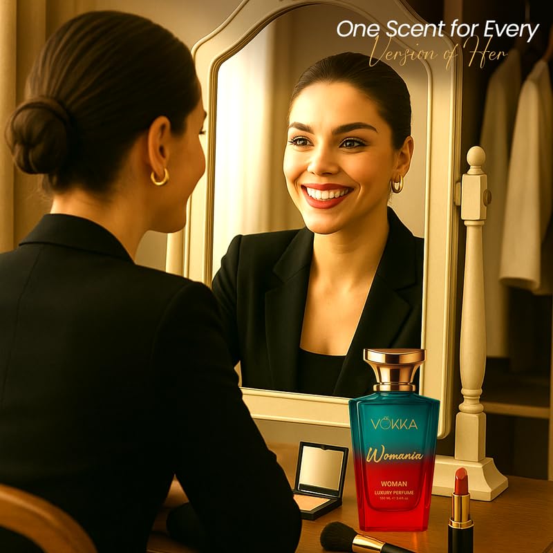 A Signature Scent for a Signature Woman – VOKKA Womania She walks into a room—and everything changes. Introducing VOKKA Womania, a luxurious Eau De Parfum that captures the soul of the Indian woman: strong, stylish, and unapologetically graceful. Womania is a celebration of every role she plays—from modern professional to timeless beauty. The top notes bloom with a radiant burst of saffron, passionfruit, grapefruit, tangerine, and peach, evoking a confident first impression. As the fragrance settles, a delicate floral bouquet of peony, vanilla orchid, cherry blossom, jasmine, and lily-of-the-valley unfolds—soft, romantic, and distinctly feminine. The base lingers with warm, sensual notes of amber, musk, oakmoss, and wood, grounding the fragrance in elegance and strength. Crafted for daily wear, yet glamorous enough for special evenings, VOKKA Womania is more than just a scent—it’s her signature. Elegant, long-lasting, and deeply personal—this is the fragrance she’ll return to, again and again.