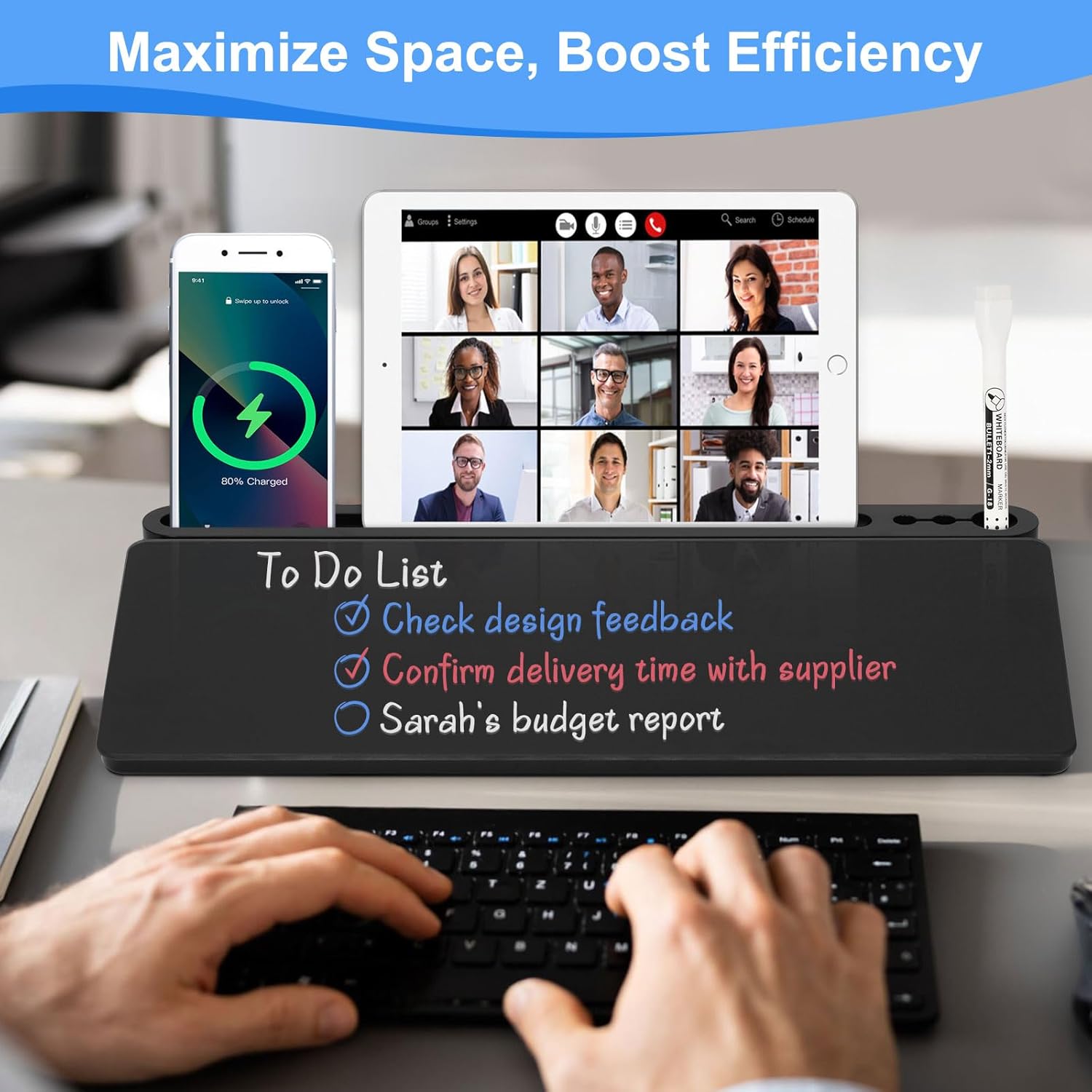 Multiple Functions – To enhance the overall convenience of the product, this whiteboard includes 1 large pen holder, 2 small pen holders and 1 slot on the top which can hold 3 markers, a tablet and a phone. Equipped with charging port notch in the slot, the desk board is a good option to realize office charging, and you can charge your phone quickly. This dry erase board is more ergonomic with the perfect ramp design and non-slip design, which can make itself be used as keyboard pad.