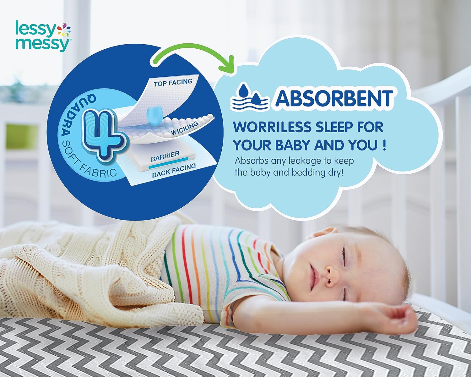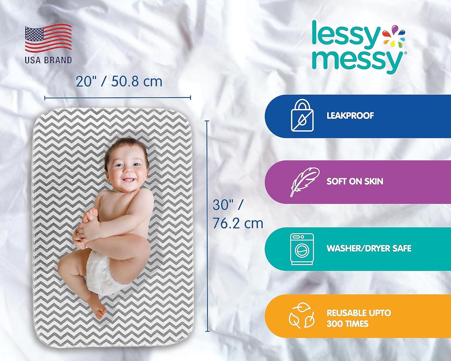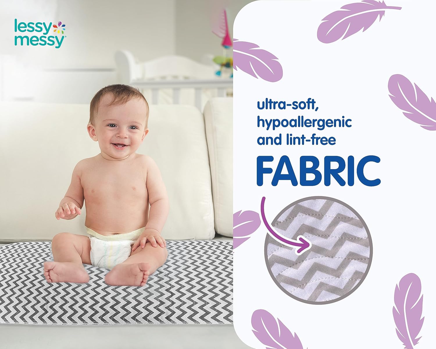 Lessy Messy Baby Sleeping/ Changing mats are made of two layers of waterproof and leak-proof materials that do not let fluids seep through while absorbing liquid quickly without letting it spread. A nice, clean and dry changing pad surface means a happy baby. For best absorbency, wash changing pad sheet before first use.
