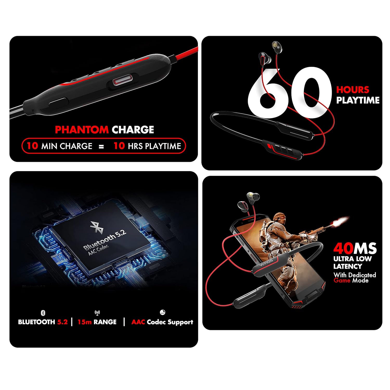 Wings Phantom 1100 Gaming Neckband with ENC, Dual Pairing, (10mins = 10hrs Playtime) 60 Hours, 5.2 BT Version, 40ms Low lag, 15m Wide Range, IPX5 Resist, with LED Lights Gaming Effects