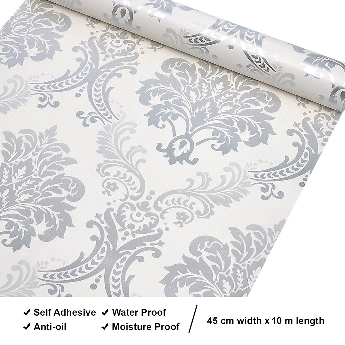 HOME DECOR, MULTI-USE: This decorative damask floral pattern self-adhesive pvc wallpaper is ideal to decorate wall of bedroom, living room, hall, kitchen, bathroom, kids room, play room, nursery, study, office, restaurants, etc. Can be applied on furniture, smooth putty wall or renovate kitchen counter tops, cupboard, shelf liner, furniture, dining table, centre table, home/office desk, side tables, almirah, fridge, drawers, lamination, and tiles as well.
