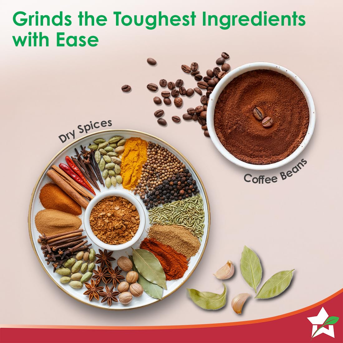 HIGH-SPEED 22,000 RPM FULL COPPER MOTOR: Grind even the toughest ingredients effortlessly with a powerful 500W, full copper motor – delivering double the speed of ordinary mixer grinders.