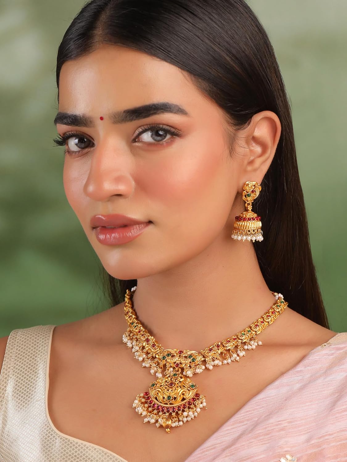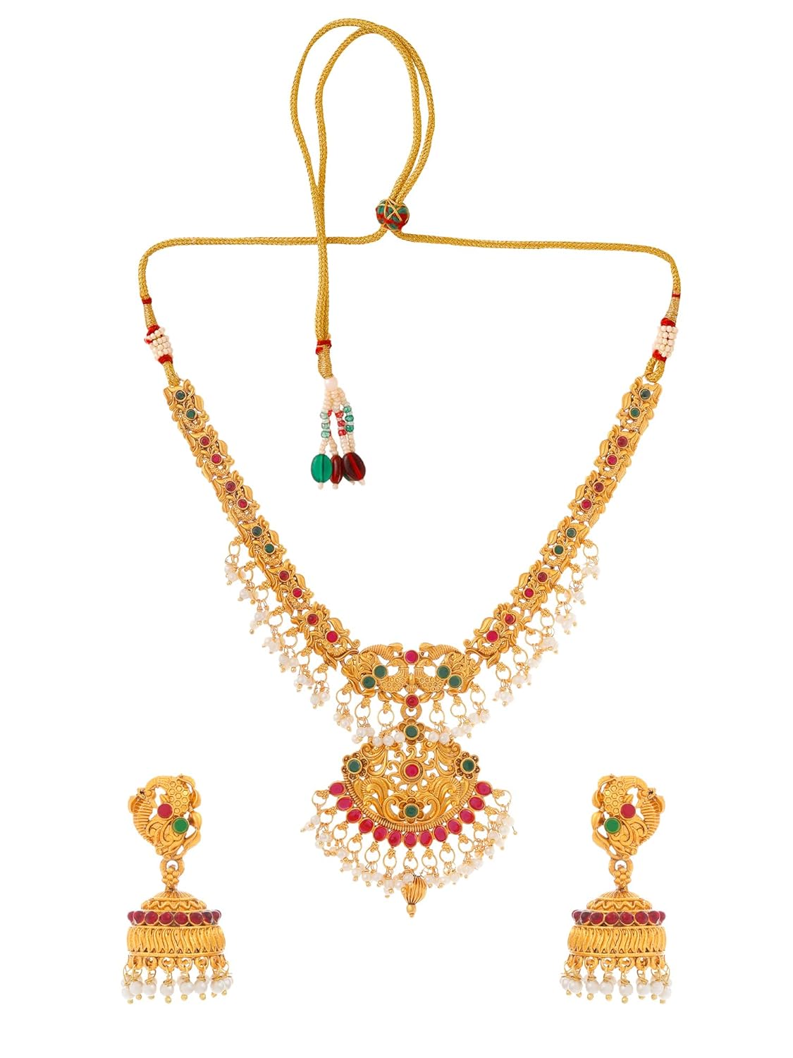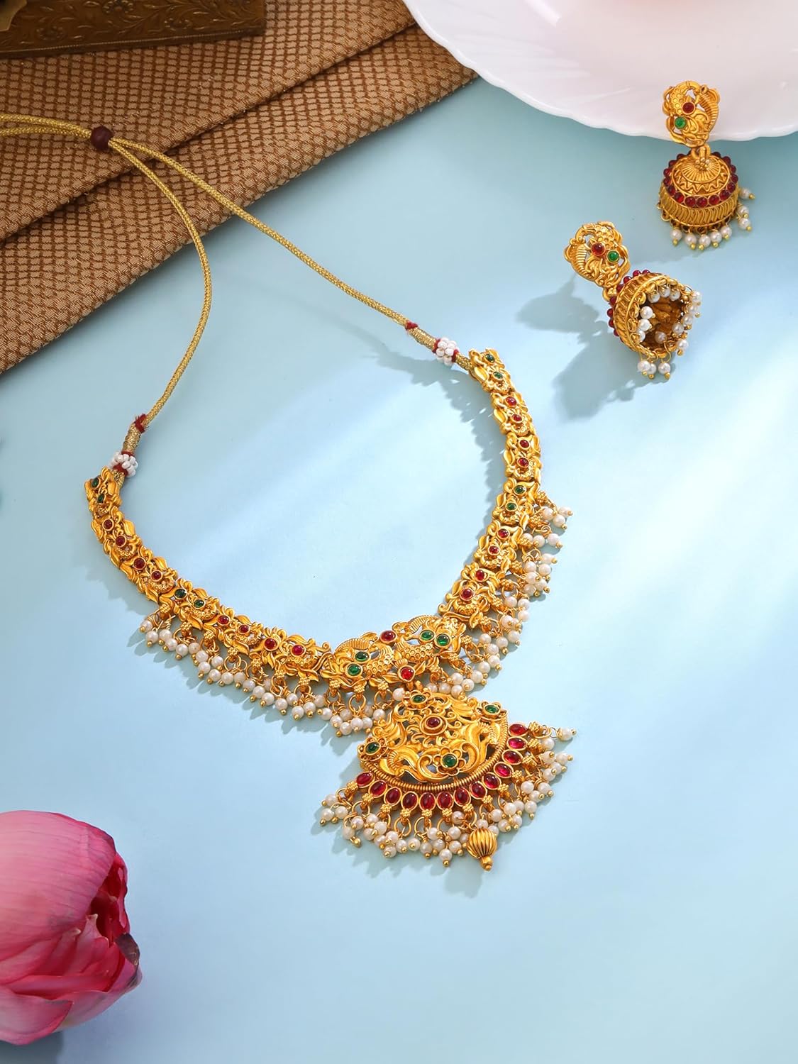 Yellow Chimes Necklace Set For Women And Girls Traditional Jewellery Set for Women Gold-Plated Temple Stone-Studded Necklace Set For Girls