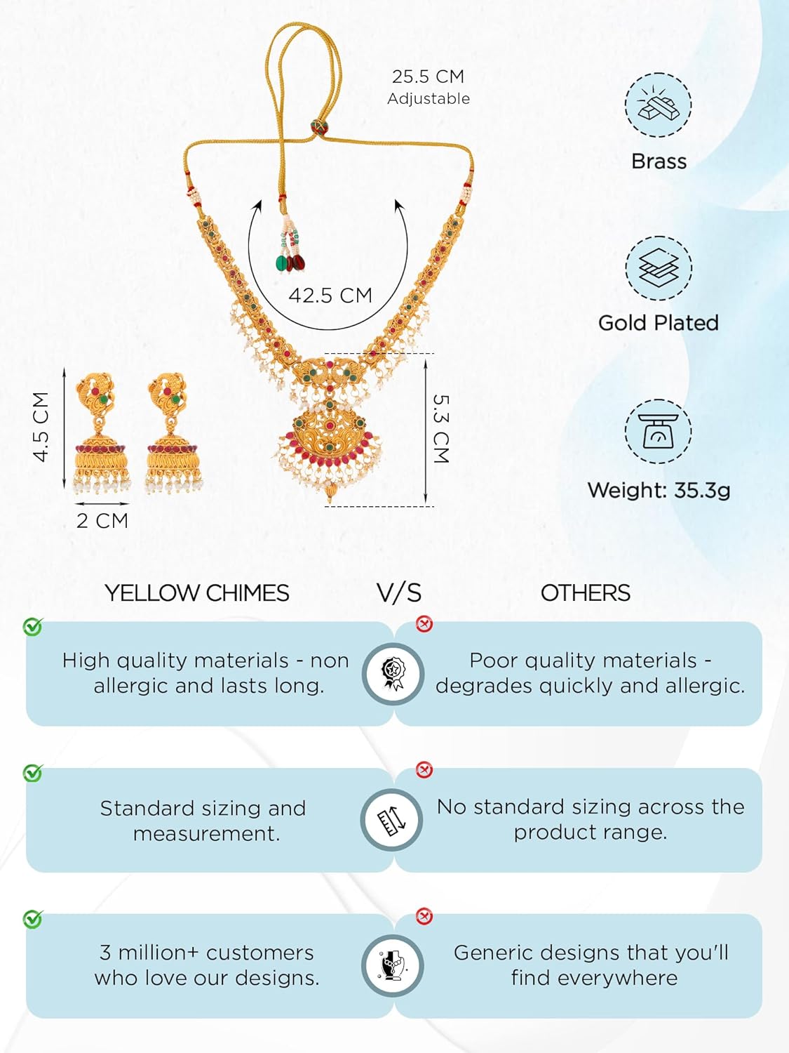Be the first to review “Yellow Chimes Necklace Set For Women And Girls Traditional Jewellery Set for Women Gold-Plated Temple Stone-Studded Necklace Set For Girls”