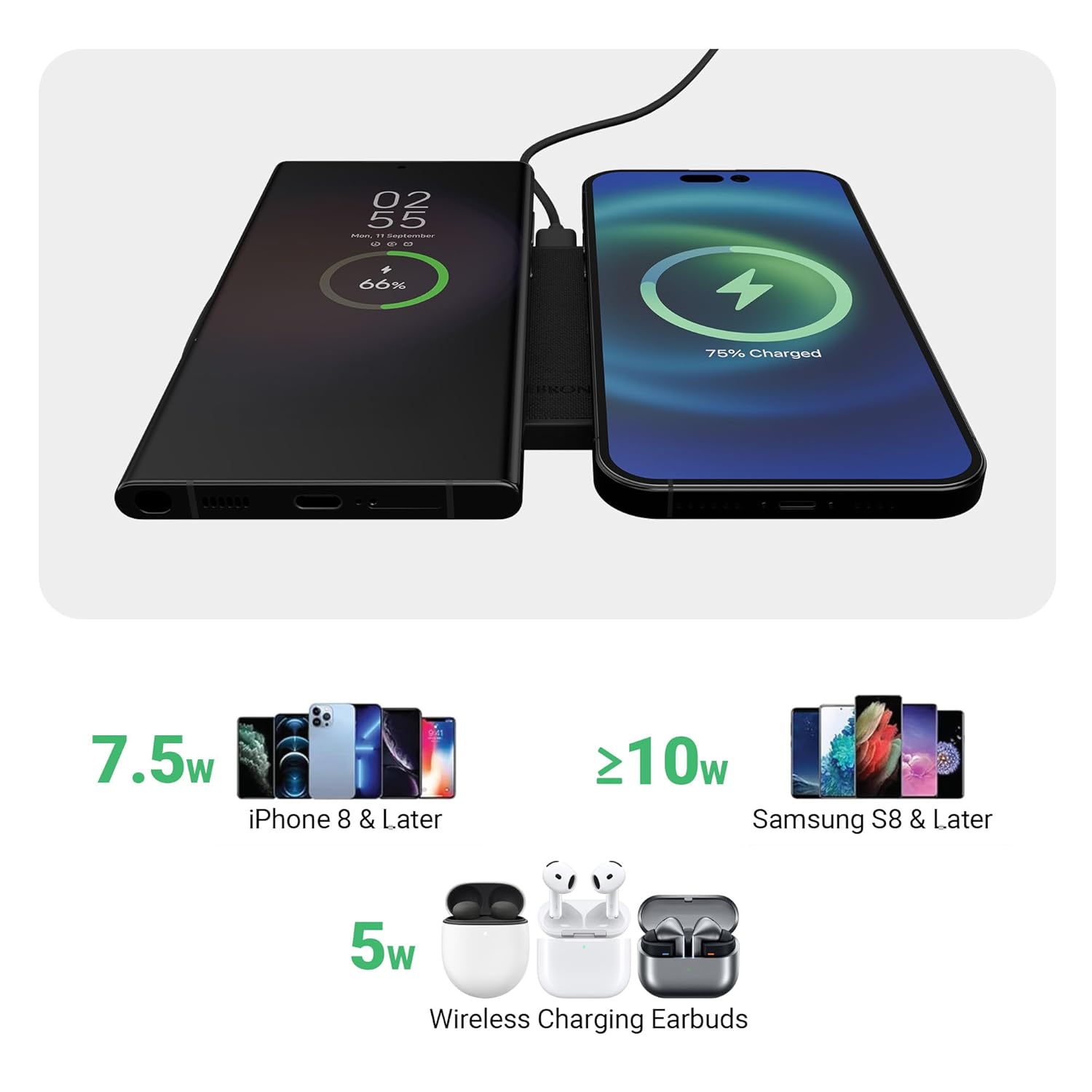OUTPUT POWER: The dual 15W charging pad delivers up to 30W output (Max.), enabling fast and efficient charging for two devices, such as smartphones and earbuds, simultaneously.