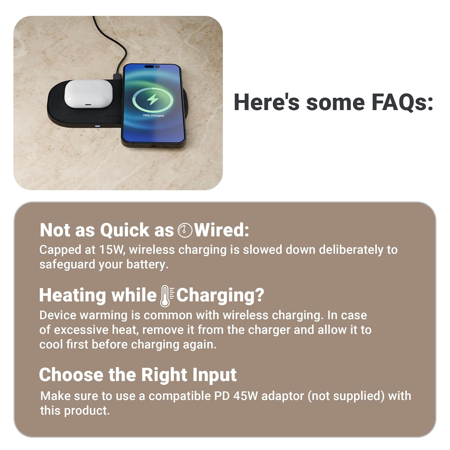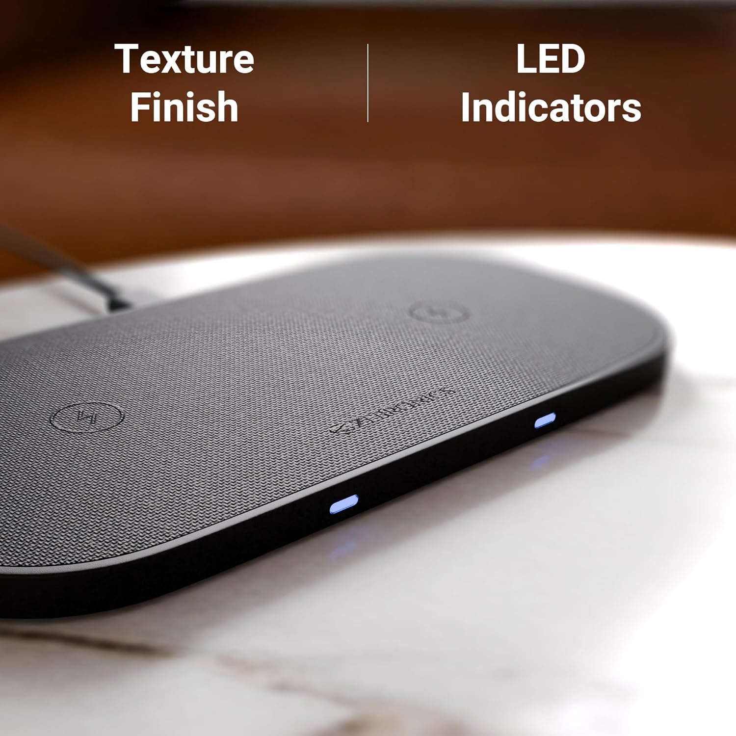 TEXTURE FINISH: Designed with an elegant texture finish, the 2-in-1 charging pad not only performs well but also adds a premium touch to your desk or nightstand.