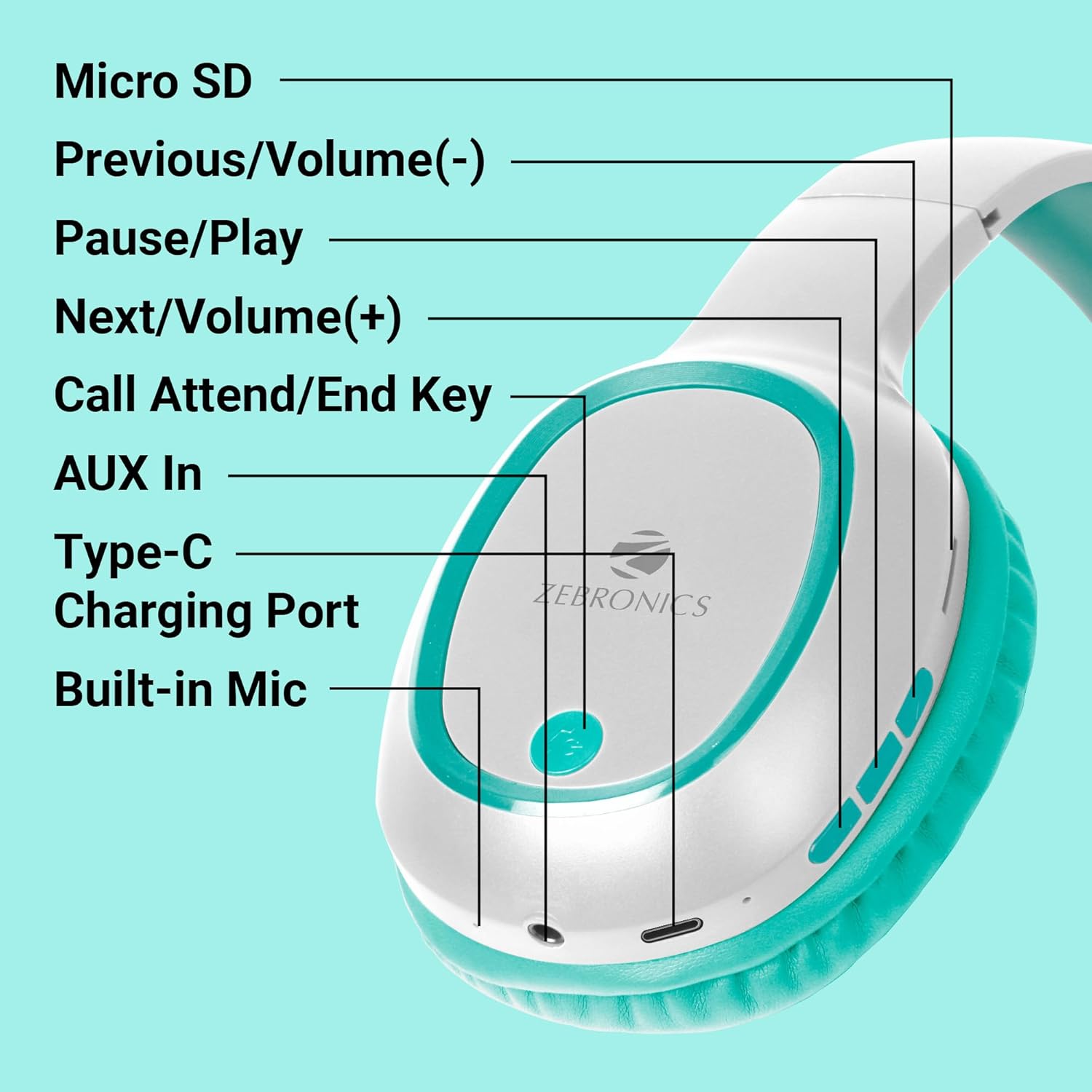ZEBRONICS Thunder Bluetooth 5.3 Wireless Over Ear Headphones with 60H Backup, Gaming Mode, Dual Pairing, Enc, Aux, Micro Sd, Voice Assistant, Comfortable Earcups, Call Function (Sea Green)