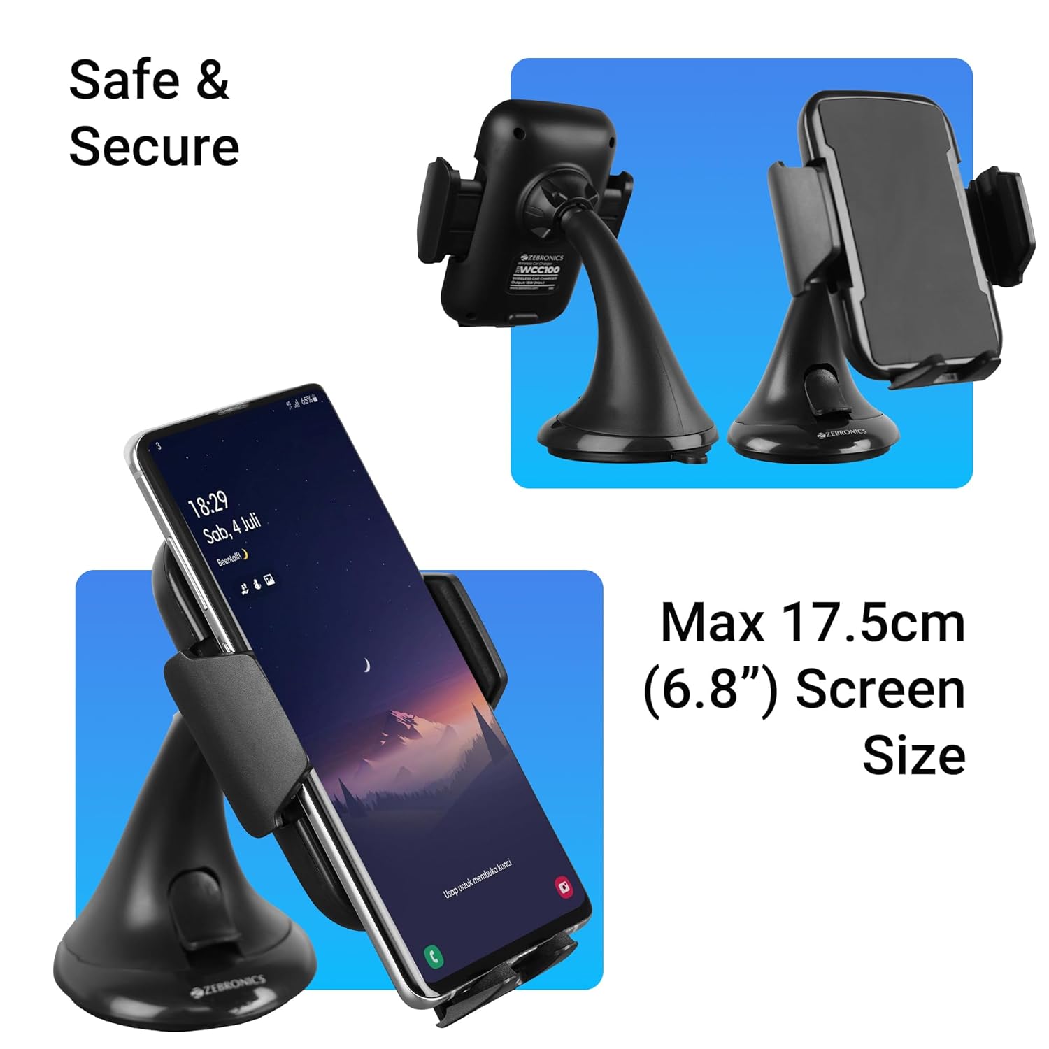 Get your hands on the ZEB-WCC100 wireless car charger with 15W fast charging capability and a 360° rotatable holder, it supports devices up to 17.5 cm in screen size. The strong suction cup ensures secure placement on windshields, dashboards, or other suitable surfaces. Featuring a one-press lock and release, a Type-C input port, and built-in safety protections, the ZEB-WCC100 ensures a secure and efficient charging experience. A 1-meter cable is included for added flexibility, making it the perfect companion for on-the-go charging.