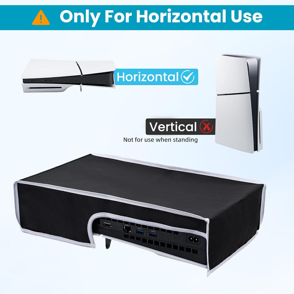 CUSTOM-TAILORED FIT: Specifically engineered for the PS5 Slim, this ps5 slim dust cover accommodates both Digital and Disc Editions in horizontal orientation, providing an exact fit that ensures comprehensive protection against external damages. The size of the PS 5 slim cover is 14.17*8.66*3.74 inch