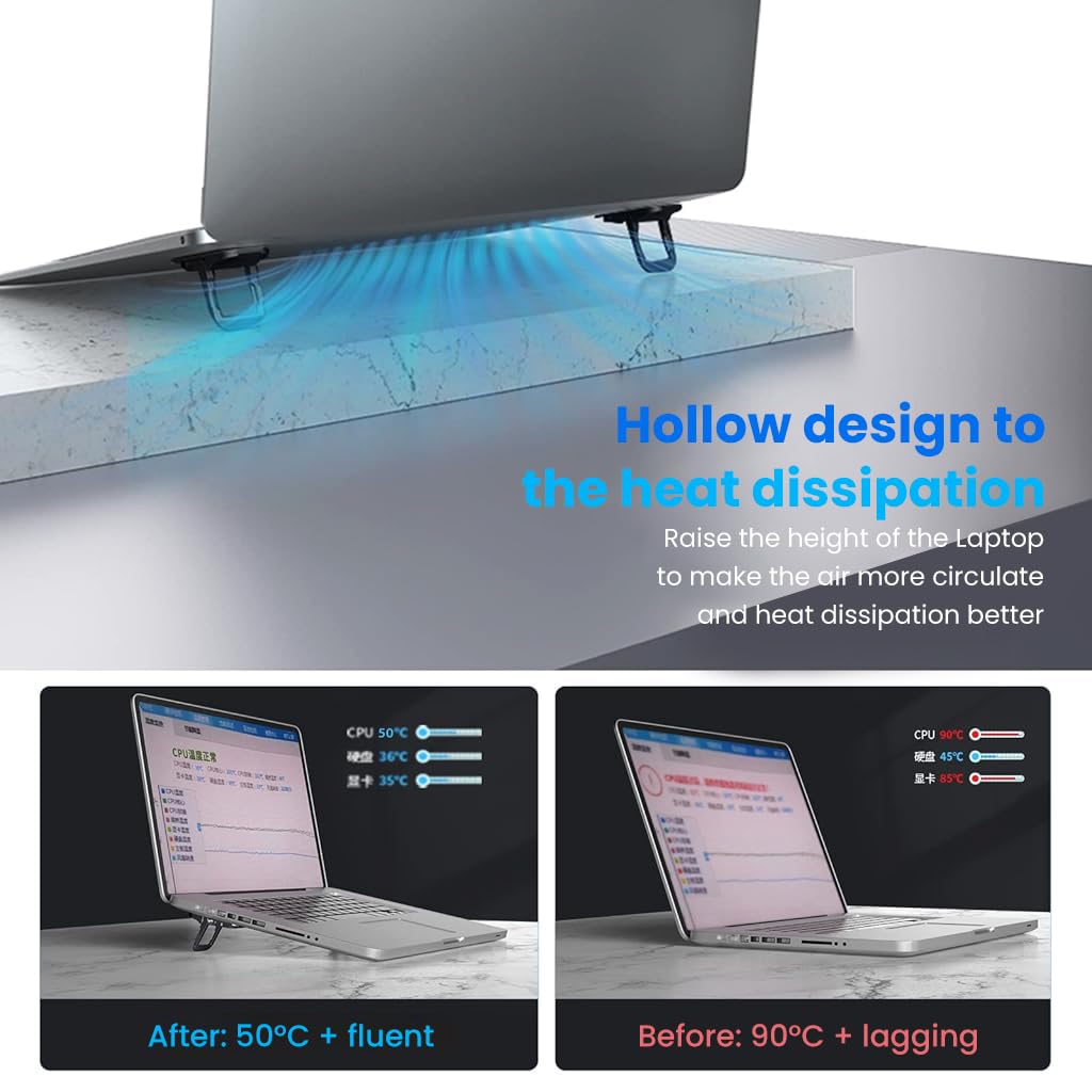 PREMIUM ALUMINUM ALLOY MATERIAL: Crafted from high-quality aluminum alloy, these Mini Laptop Risers offer excellent strength and stability. Their robust build ensures long-lasting performance, and they can effectively support the weight of most laptops.